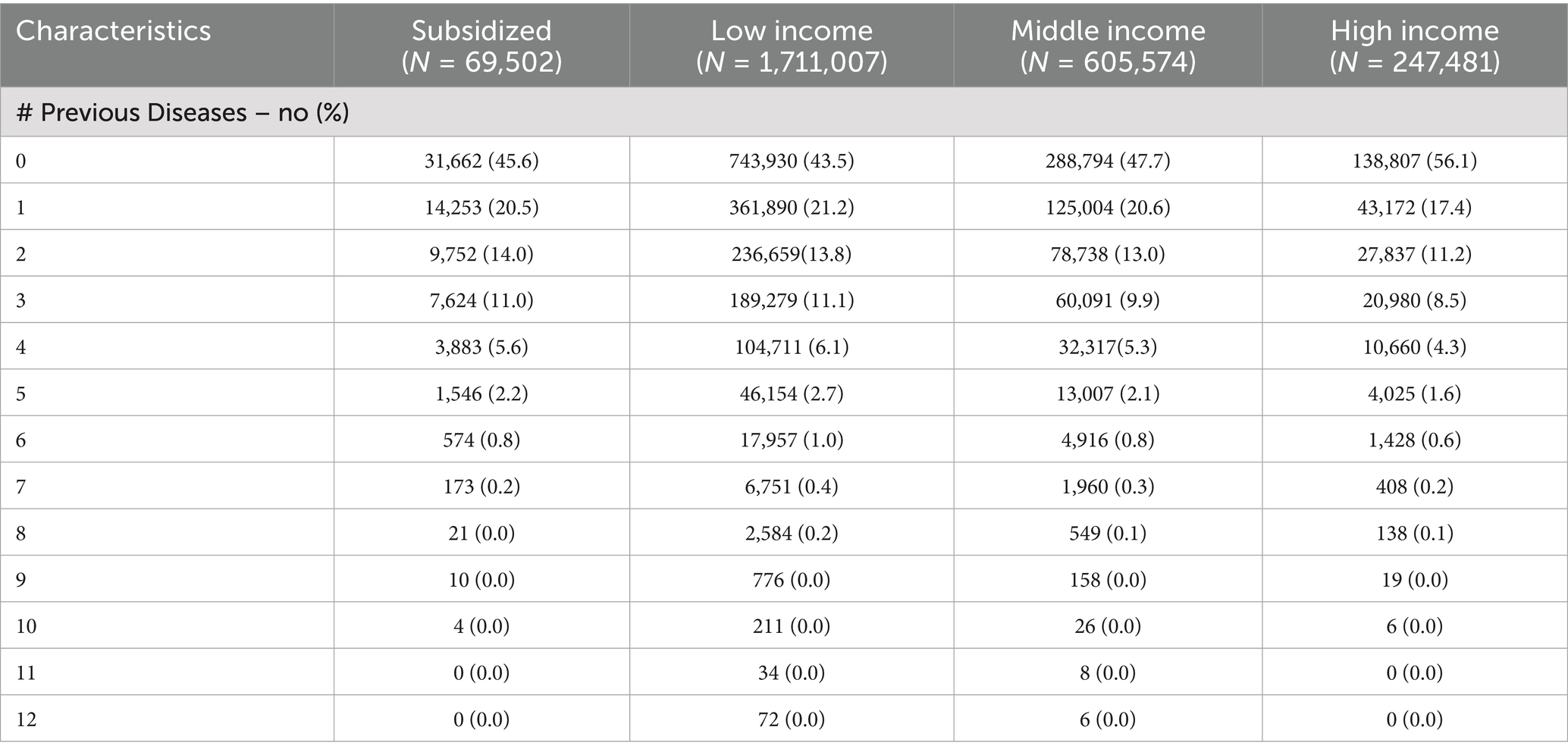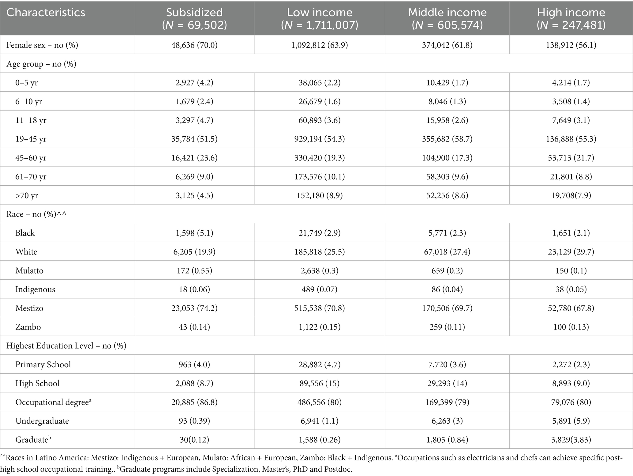 TM users stratified by income level. In the subsidized group (predominantly unemployed), 70.0% of users were female whereas 56.1% were in the high-income group (Table 4). Approximately 52% of TM users aged 19–45 years were in the subsidized group whereas 55.3% were in the high-income group. Most TM users were mestizo ethnicity in both the subsidized (74.2%) and high-income groups. Finally, 86.8% of TM users who were in the subsidized group had occupational degree and 80.0% who had occupational degree were in the higher-income group. In terms of number of preexisting conditions, a higher proportion of TM users had zero followed by 1 and 2 across all income level groups (Table 5).