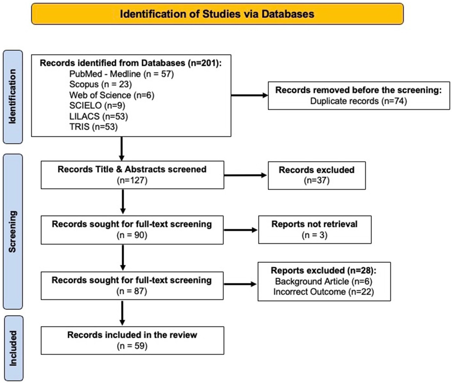 Flowchart illustrating the identification of studies via databases. Initially, 201 records were identified, with 74 duplicate records removed. Titles and abstracts of 127 records were screened, excluding 37. A total of 90 records were sought for full-text screening, with 3 not retrieved. Of 87 records screened, 28 were excluded for reasons such as background article (6) and incorrect outcome (22), resulting in 59 records included in the review.