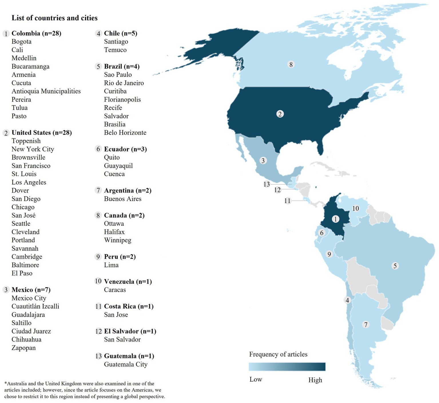 Data extraction was performed independently by three of the authors (RGR, MFS, FP). Data extraction was completed using a template developed by the authors in Microsoft Excel. The extraction document included multiple fields divided into descriptive and result extraction fields. Descriptive extraction fields included study characteristics, strategies of Open Streets programs, and identified gaps and opportunities in the articles (see data extraction codebook in Supplementary Table 2). During the data extraction phase, we analyzed the settings in which the included articles were conducted, enabling us to assess the frequency of these articles by country within the Americas. To accomplish this, we compiled the frequency of articles by country and city and then developed a map using Microsoft Excel to represent the data visually. This was developed to identify the countries with the highest representation and to discern whether the articles were based in the Global North or the Global South.