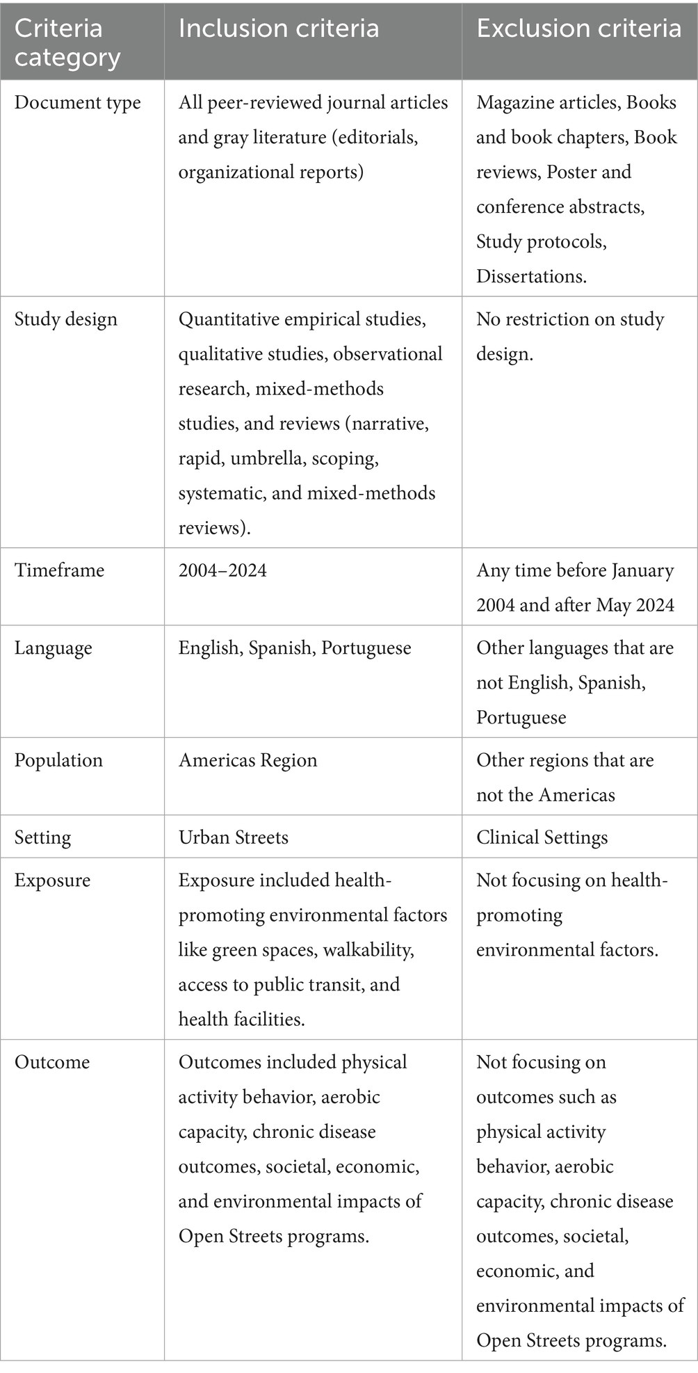 As seen in Table 1, we included peer-reviewed journal articles published between 2004 and 2024 in English, Spanish, and Portuguese. Studies employing a variety of designs were considered, including quantitative empirical studies, qualitative studies, observational research, mixed-methods studies, and reviews (narrative, rapid, umbrella, scoping, systematic, and mixed-methods reviews). There were no restrictions on the population studied, and eligible studies were required to be conducted in community settings (e.g., schools or workplaces) but not in healthcare settings where interventions involved one-on-one advice or counseling. Studies with outcomes evaluating physical activity behavior, aerobic capacity, chronic disease outcomes, or the societal, economic, and environmental impacts of Open Streets or Ciclovia programs were included. Exposures included, but were not limited to, quantitative indicators of health-promoting environmental characteristics, such as green spaces, walkability, access to amenities, public transportation, or health facilities. We only included studies conducted in the Americas, and they had to provide sufficient details about the intervention, particularly concerning Open Streets or Ciclovia programs.
