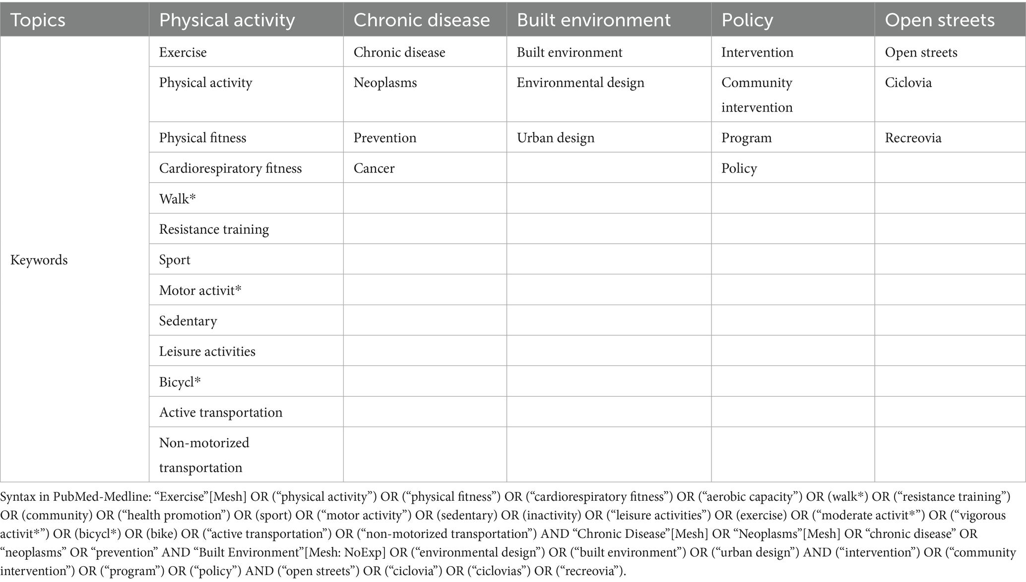 The search strategy was conducted in May 2024 with the assistance of a librarian, and it included articles published from January 2004 to May 2024, spanning the last 20 years, to capture recent program developments. Six electronic databases (PubMed, Web of Science, Scopus, Scielo, Lilacs, and Transportation Information Services (TRIS)) were systematically searched. PubMed, Scopus, Web of Science, and TRIS were searched in Spanish and Portuguese with translations of the keywords. Scielo and Lilacs were searched using English and Spanish keywords. We selected keywords based on five types of search terms, including “physical activity”, “chronic disease”, “built environment”, “policy” and “Open streets” terms. The search incorporated combinations of these keywords, outlined in Table 2 (for the complete search strategy, see Supplementary Table 1).