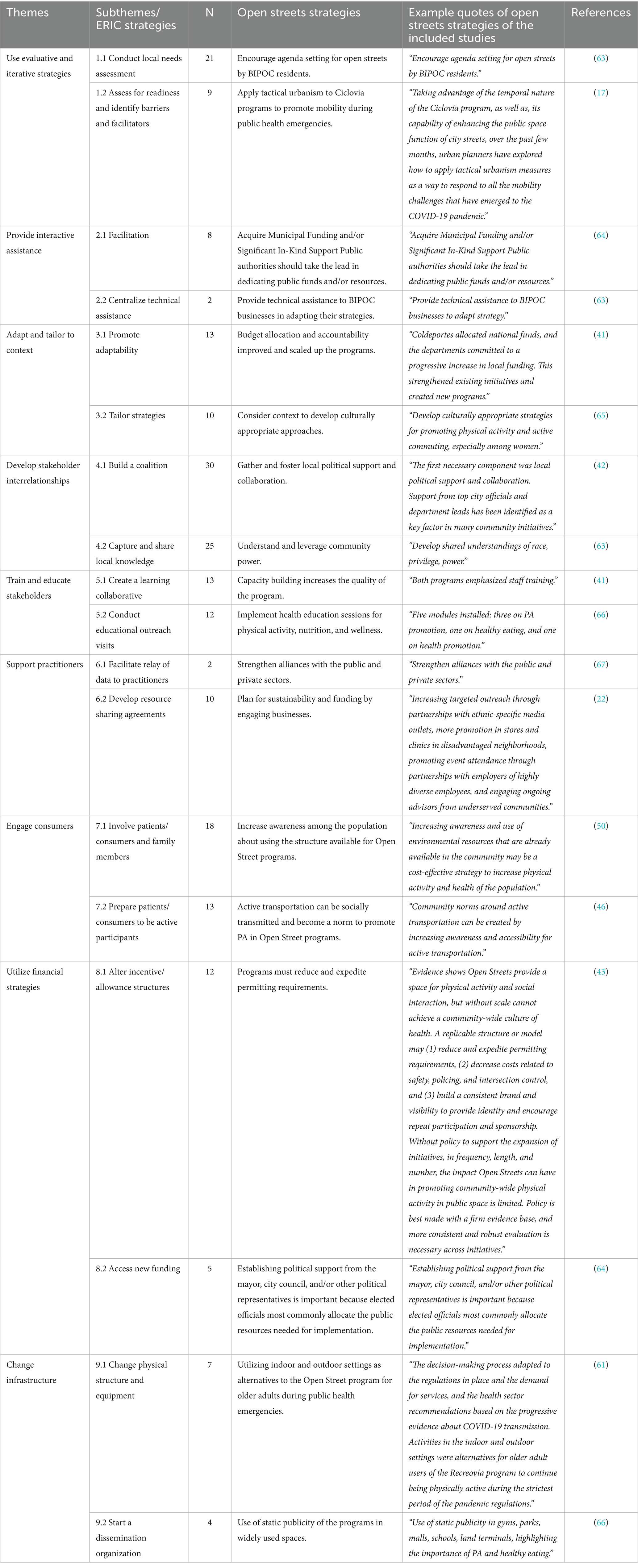Figure 3 presents the top ten ERIC strategies matched with the Open Streets strategies identified in this review. The most aligned ERIC strategy identified was “Build a coalition” (n = 30), followed by “Capture and share local knowledge” (n = 25), and “Conduct a local needs assessment” (n = 21). Other frequently matched strategies included “Involve participants/consumers and family members’ (n = 18), followed by “Identify and prepare champions” and “Inform opinion leaders’ (n = 16 each). Additionally, the strategies “Promote network weaving” (n = 14), “Prepare participants/consumers to be active participants,” “Promote adaptability,” and “Create a learning collaborative” were each matched with 13 Open Streets strategies. Using the thematic analysis approach, we categorized the identified Open Streets strategies into nine themes and 52 sub-themes (see Supplementary Table 5). Table 4 presents example quotes from Open Streets strategies in studies included in the review, organized by theme and the two most prevalent sub-themes.