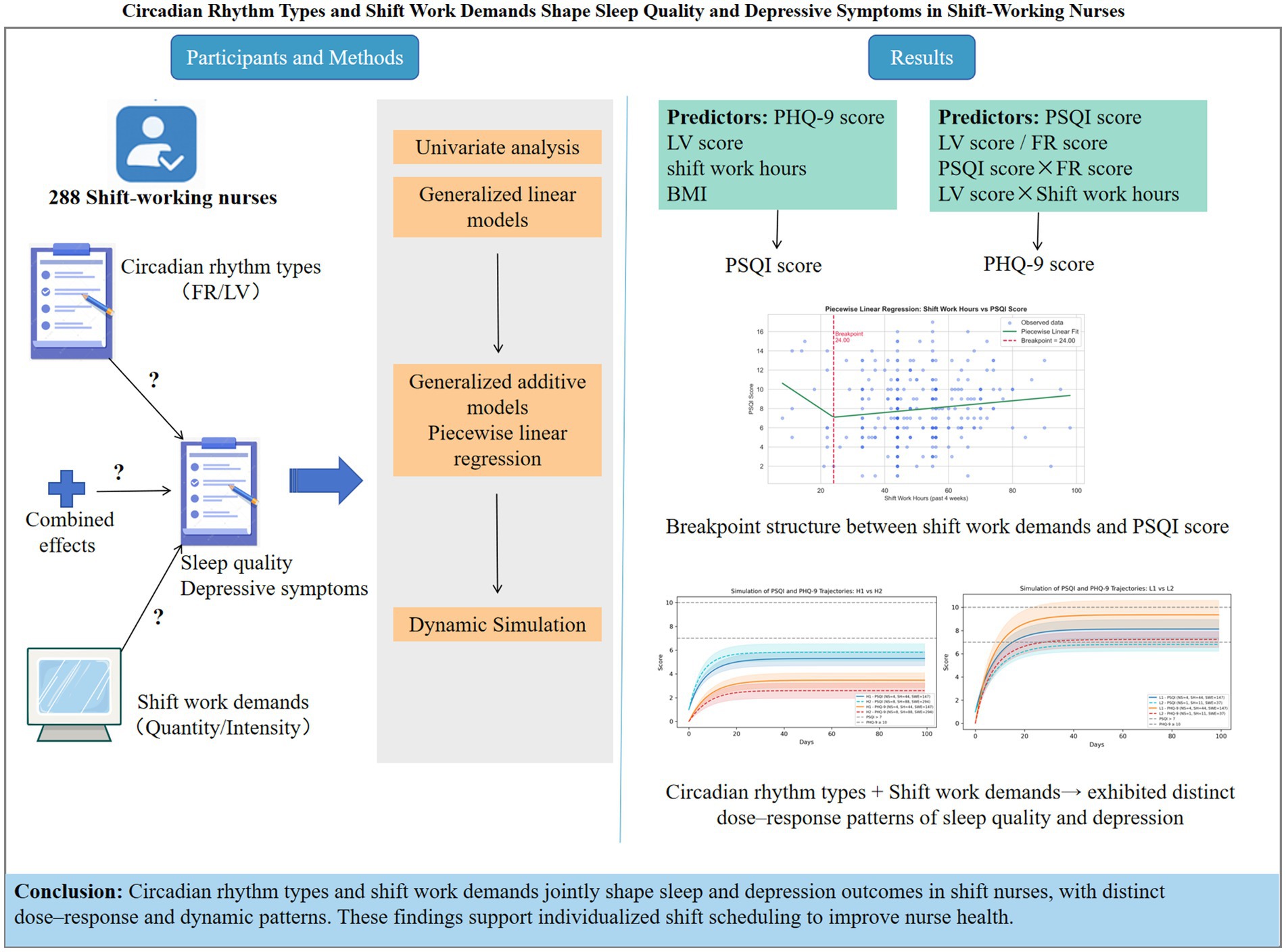 Conclusion: Circadian rhythm types and shift work demands jointly shape sleep quality and depressive symptoms in shift nurses, with distinct dose–response patterns. These findings highlight the importance of circadian-informed shift scheduling to improve sleep and mental health among shift nurses.
