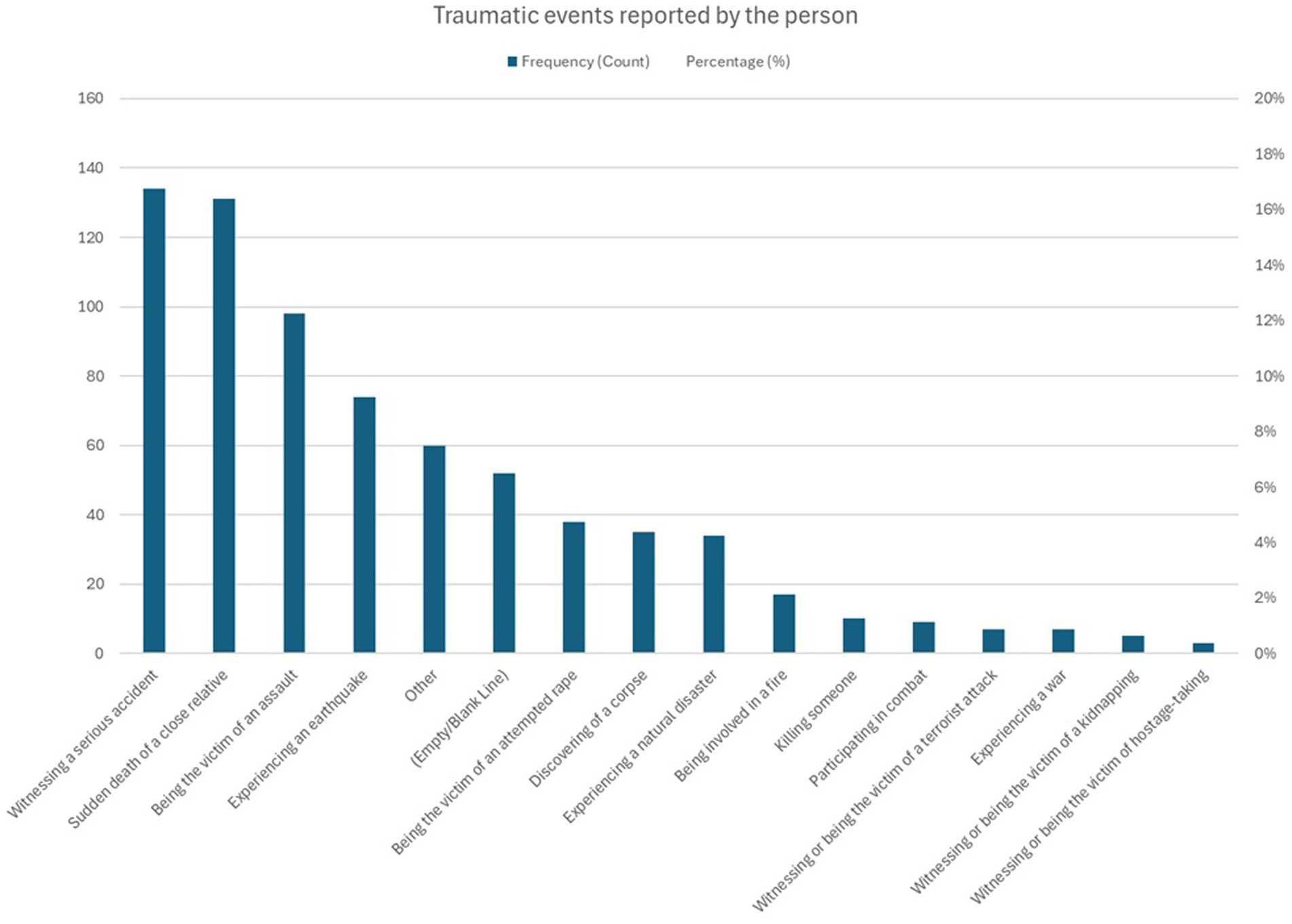 Overall, of the 881 participants, 394 (44.7%) answered that they had experienced an unusual traumatic event and 139 thought frequently or dreamed about it or had the impression of reliving it. Of the 394 individuals who had experienced an unusual traumatic event, 67 (17%) developed PTSD. The nature of the most common events is shown in Figure 1. When broken down by country of origin, individuals from Haiti most frequently reported experiencing an earthquake (Supplementary Figure S1). Individuals with low family income reported more violent assaults (Supplementary Figure S2). Supplementary Figures S3, S4 show PTSD prevalence by age group and by sex, respectively (see Table 2).