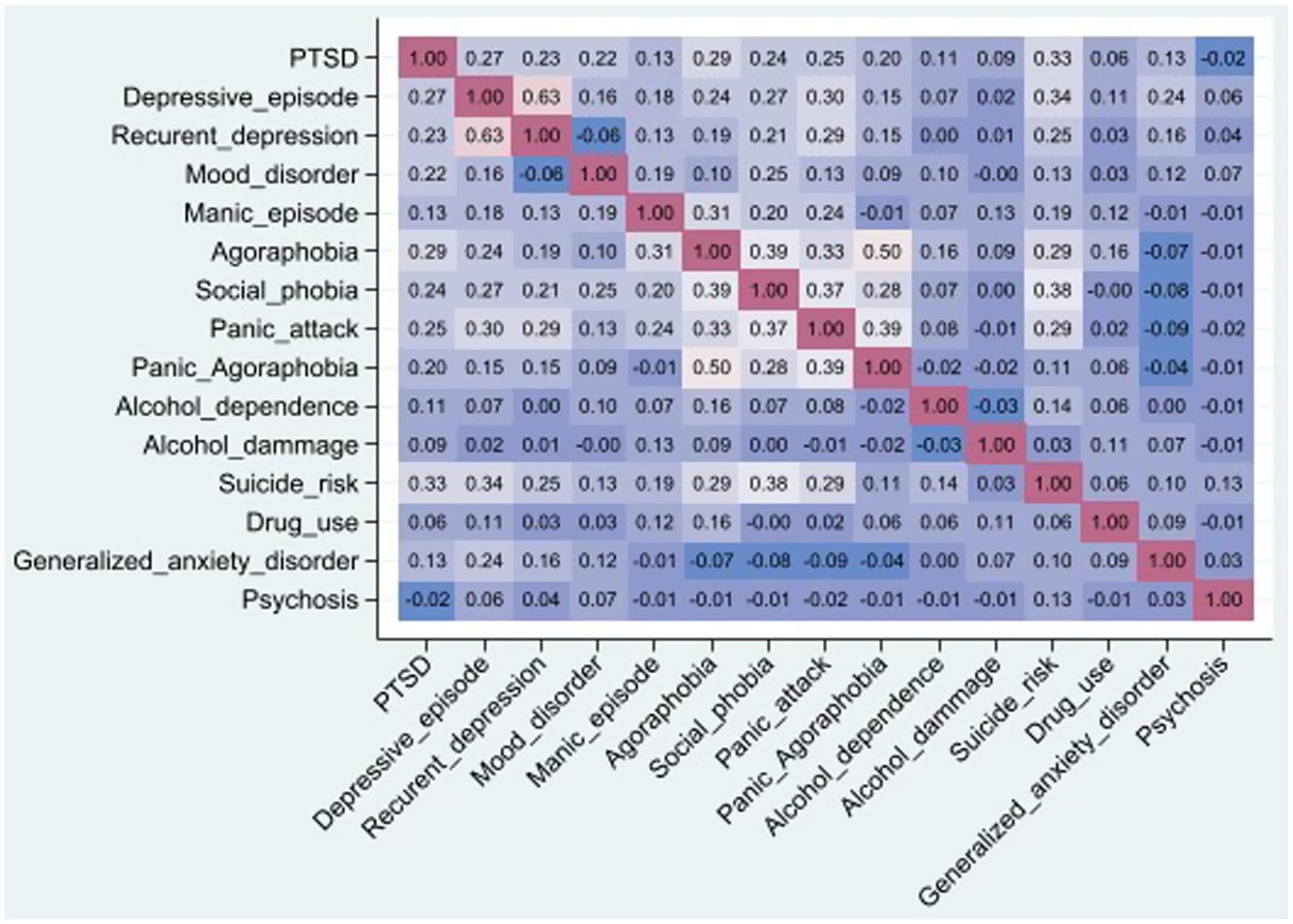 Figure 2 shows the heatmap of different psychiatric diagnoses. PTSD was most related to suicide risk, depressive episodes and recurrent depression, mood disorder, agoraphobia, social phobia, panic, and psychosis.