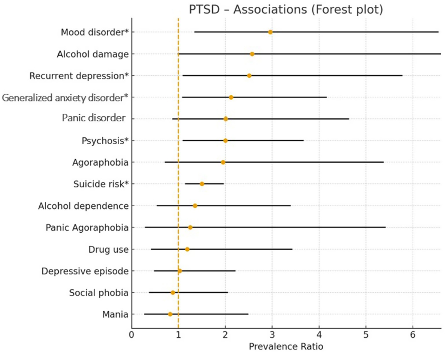 Figure 3 shows the forest plot representing the adjusted relationship between PTSD and different psychiatric diagnoses. After adjustments, suicide risk, alcohol damage, recurrent depression, mood disorder, generalized anxiety disorder, and psychosis were independently associated with PTSD.