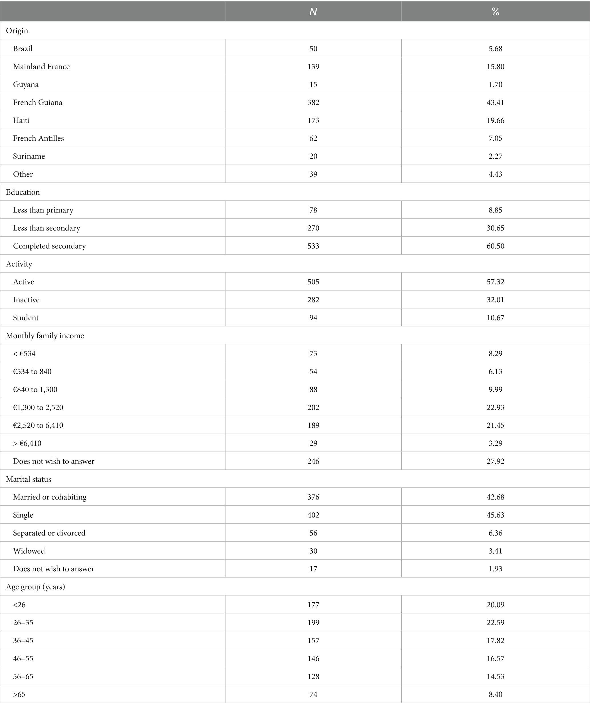 Table 1 shows the sociodemographic characteristics of the sample. Two-thirds of the sample population were of French origin. More than a third of the sample had less than a secondary education, and 14.4% had a monthly family income below €840. Fewer than half of the sample were couples. Approximately two-thirds of the non-students were professionally active.