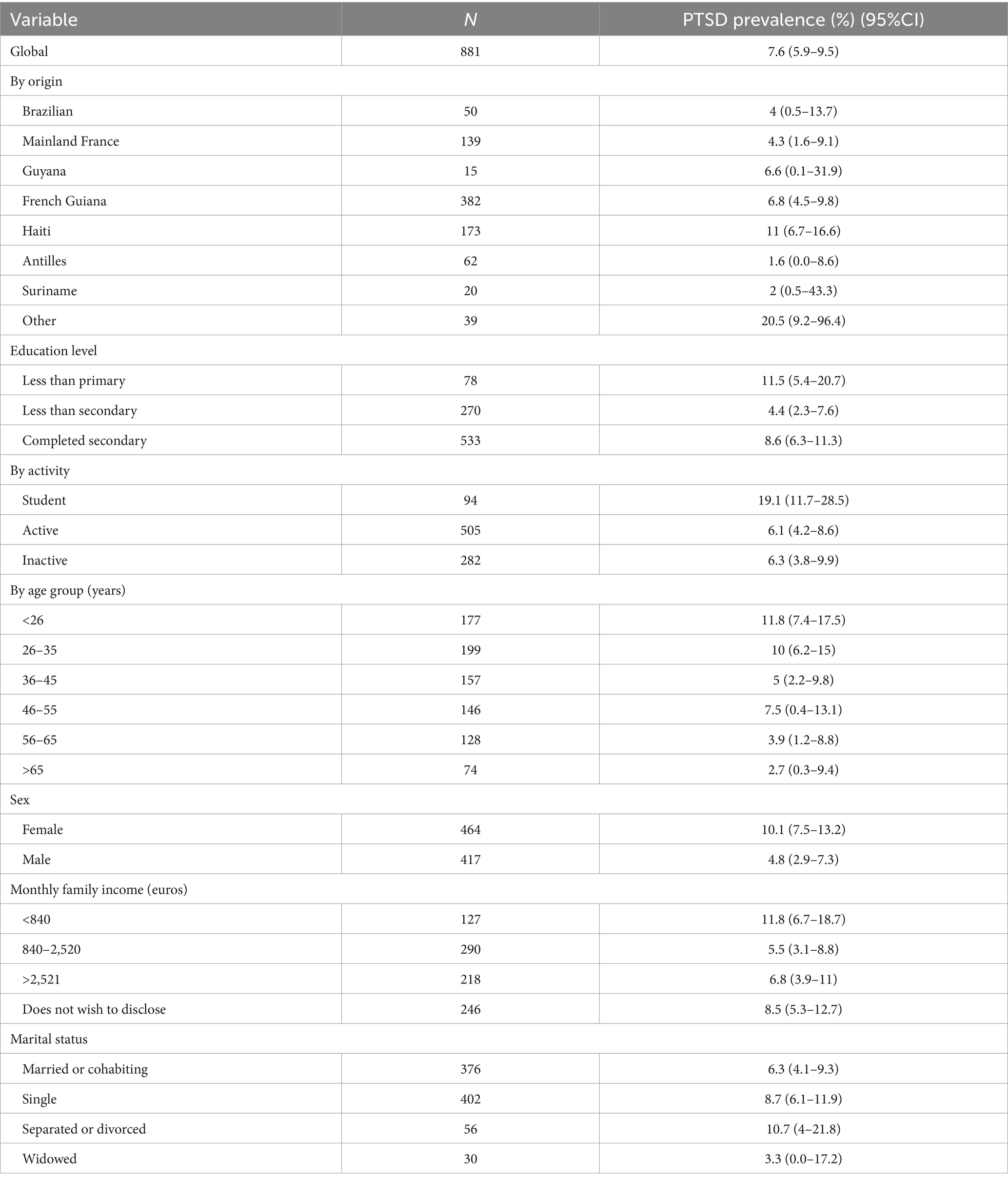 Results: The overall prevalence of PTSD was 7.6 [95%CI = 5.9–9.5]. After adjusting for potential confounders among sociodemographic variables, only female sex (adjusted prevalence ratio (aPR) = 2.1, 95%CI = 1.2–3.6, p = 0.006), being a student (aPR = 2.4, 95%CI = 1.0–5.6, p = 0.05), being from Suriname (aPR = 5.8, 95%CI = 1.0–33.4, p = 0.05), not having completed primary education (aPR = 3.4, 95%CI = 1.3–8.9, p = 0.01), and being separated or divorced (aPR = 3, 95%CI = 1.1–8.2, p = 0.02) were significantly associated with PTSD. Of the 67 individuals with PTSD (46.3%), 31 sought care, 21 (31.3%) reported having received treatment for their symptoms, and 29 (43.3%) reported using alternative treatments, mostly plant-based traditional medicine. Of the 394 individuals who had experienced an unusual traumatic event, 67 (17%) developed PTSD.