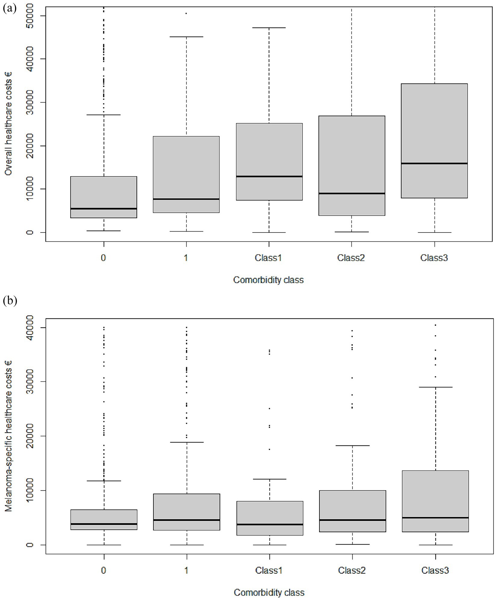 The gradient was maintained when analyses were restricted to melanoma-specific health care resources: € 13,537 (no comorbidity) versus € 20,396 (Class 3). Systemic anticancer drugs consumed approximately 55% of melanoma-specific budgets in every group (p = 0.34) (Table 4, Figure 1b).