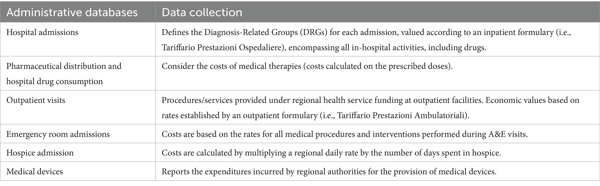 The cost analysis was evaluated from a health system perspective, considering only the direct costs incurred by the regional health care service and conducted using anonymized aggregate data. For both patient cohorts, the cost estimates encompass a 3-year period following the initial cancer diagnosis. These estimates account for disease-related expenses as provided by the Regional Health Authority. Box 1 outlines the sources and profiles of the administrative data. Each patient was assigned a unique and anonymous identification code, which was used to link all administrative data covering hospital admissions, drug prescriptions, outpatient visits, emergency room visits, hospice admissions, medical devices, and vital statuses. The average per-patient costs were calculated and stratified according to the stage of disease at the time of diagnosis. Melanoma-specific cost items were evaluated in accordance with the healthcare resources compatible with the melanoma-specific clinical pathway (20).