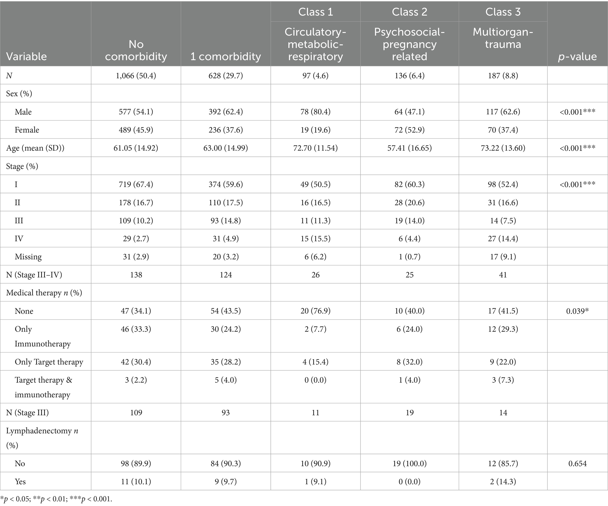 Table 2 details the characteristics of sample by comorbidity groups. There are disparities in sex distribution, with males making up the majority of cases, but with varying proportions: 54.1% versus 45.9% for those without comorbidities, 62.4% versus 37.6% with one comorbidity, and 80.4% versus 19.6% in Class 1. There are also differences in average age, with Classes 1 and 3 having higher average ages. Significant variations in cancer stage at diagnosis were found, with Stage I being more common in patients without comorbidities. Patients with comorbidities were less likely to use medical therapy (p = 0.39) especially in Class 1, compared to those without comorbidities. Additionally, only 34% of patients without comorbidities chose not to receive either immunotherapy or targeted therapy compared to 41.5% in Class 3 and 76.9% in Class 1.