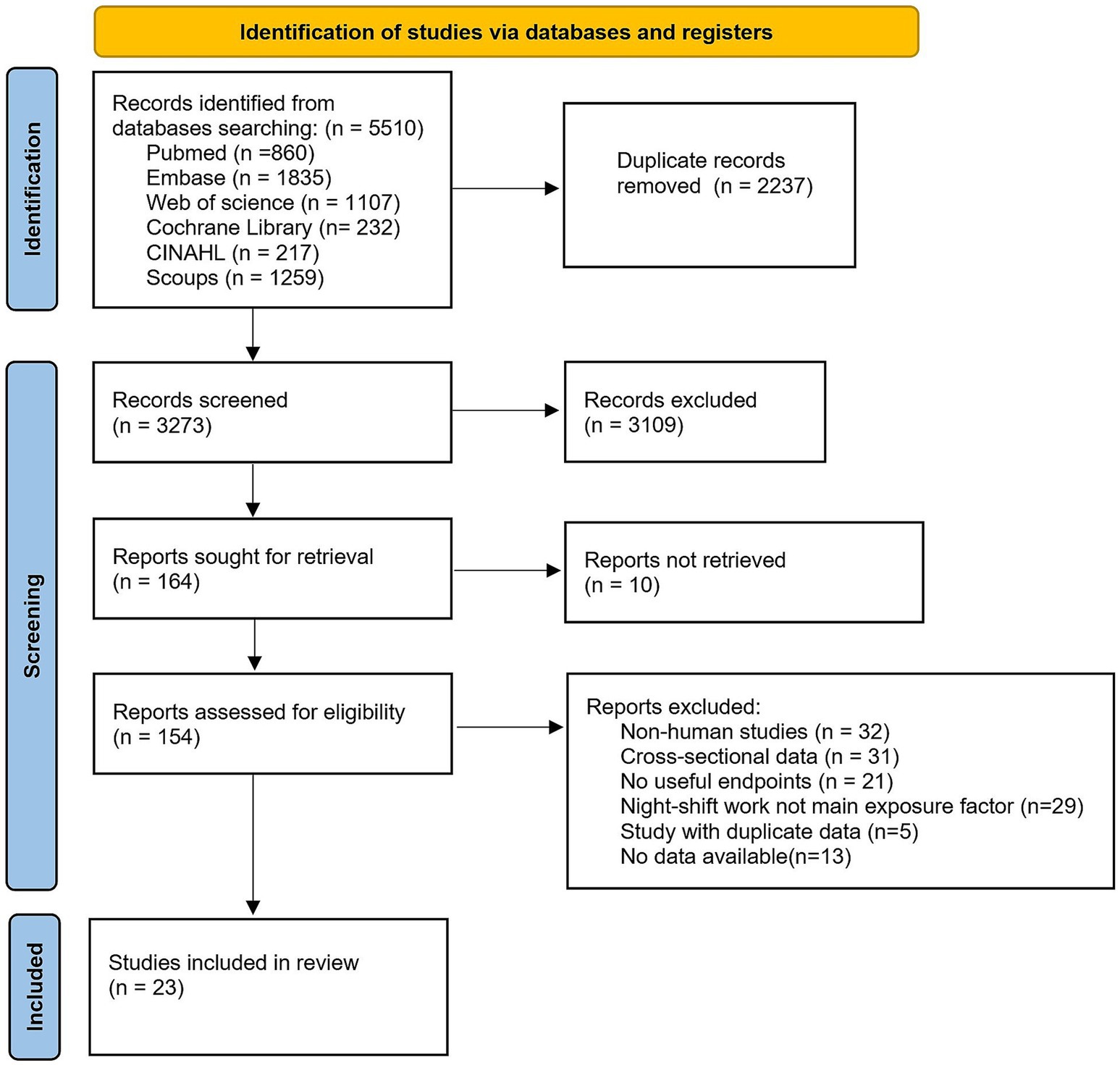 The initial database search identified 5,510 articles: 860 from PubMed, 1,107 from Web of Science, 1835 from Embase, 232 from Cochrane Library, 217 from CINAHL, and 1,259 from Scopus. After removing 2,237 duplicates, 3,273 unique records underwent title and abstract screening. Of these, 154 articles were deemed eligible for full-text review. Following detailed evaluation, 131 studies were excluded based on predefined criteria: (1) non-human studies; (2) cross-sectional design; (3) irrelevant outcomes; (4) duplicate data from overlapping cohorts; (6) insufficient data availability. Ultimately, 23 articles met all inclusion criteria and were included in the meta-analysis (selection process detailed in Figure 1).