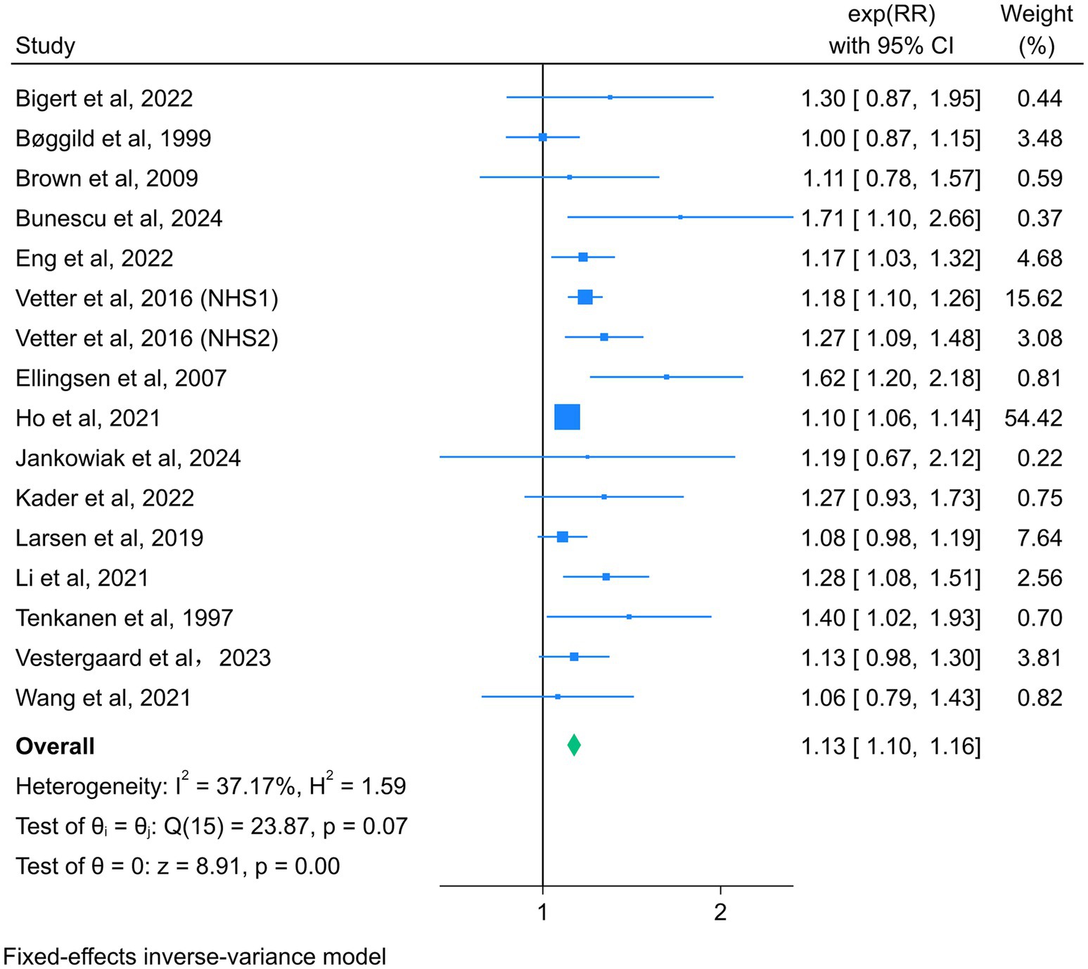 Fifteen studies reported the association between night shift work and the risk of total CVD events, with a total of 2,891,280 participants (13, 14, 19–22, 35–38, 44–46, 48, 49). Due to the absence of significant heterogeneity among the studies (I2 = 37.17%, p = 0.07), a fixed-effect model was selected for analysis. The summary RR (95% CI) was 1.13 (1.10–1.16) (Figure 2), suggesting that night shift work was associated with a higher risk of adverse cardiovascular events compared to daytime work.