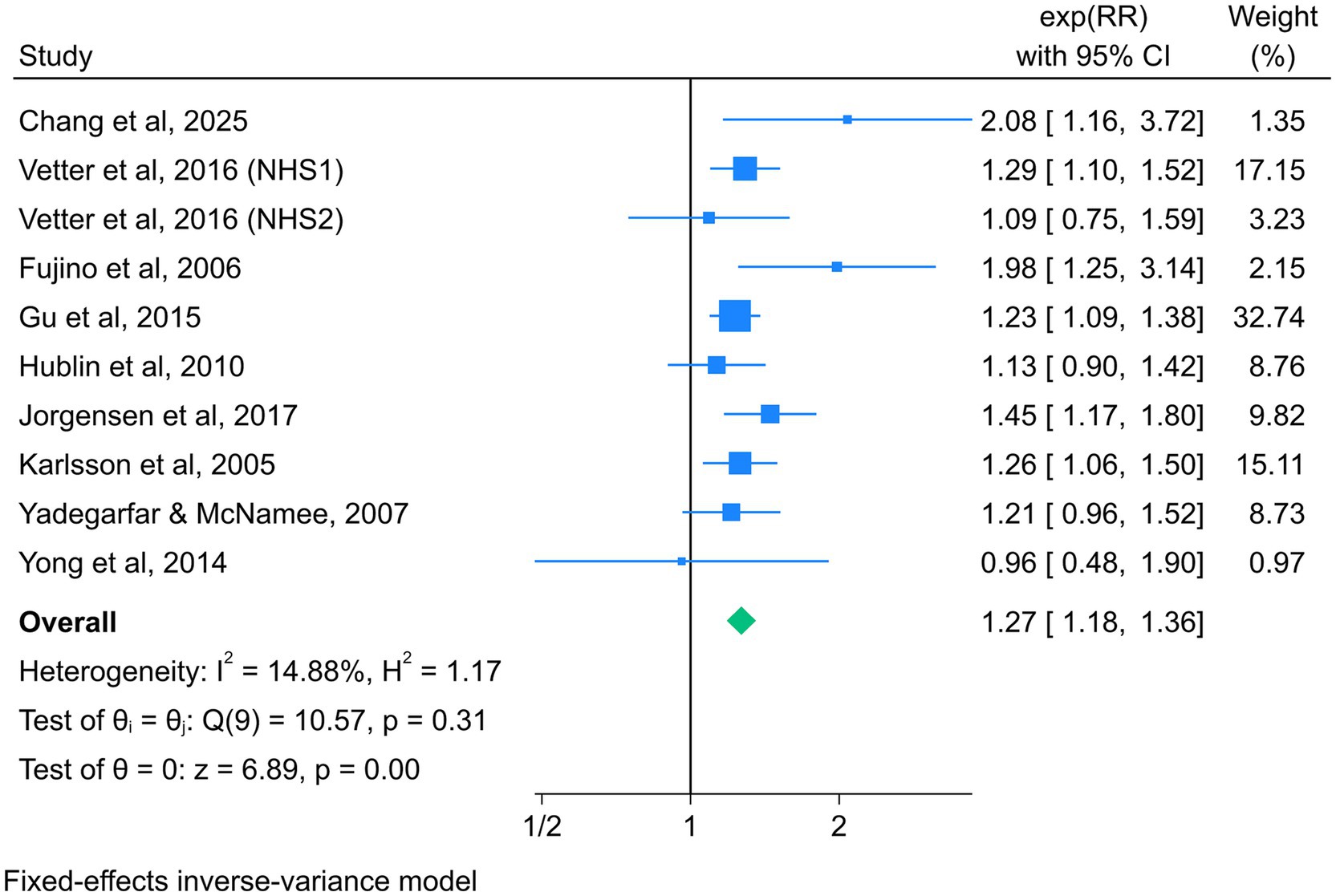 Nine studies reported the association between night shift work and the risk of total CVD mortality, with a total of 638,255 participants (38–43, 47, 50, 51). Given the absence of significant heterogeneity across studies (I2 = 14.88%, p = 0.31), a fixed-effect model was selected for analysis. The summary RR (95% CI) was 1.27 (1.18–1.36) (Figure 3), suggesting that night shift work was associated with a higher risk of adverse cardiovascular mortality outcomes compared to daytime work.