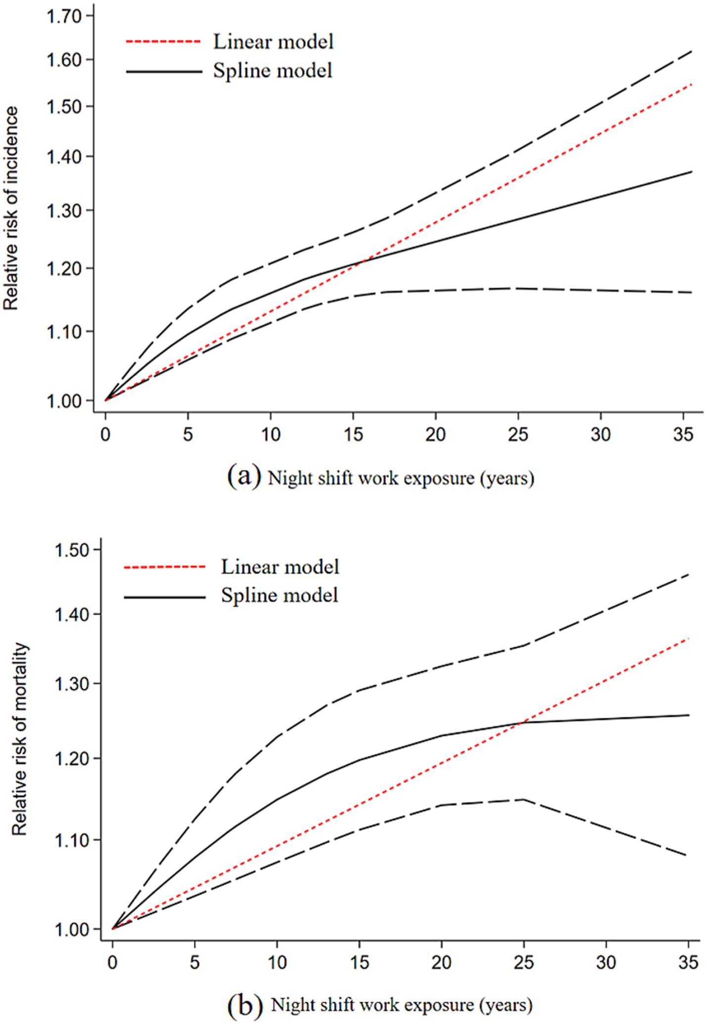 Figure 4. Dose-response relationship plot between duration of night shift work and CVD; (a) CVD incidence; (b) CVD mortality.