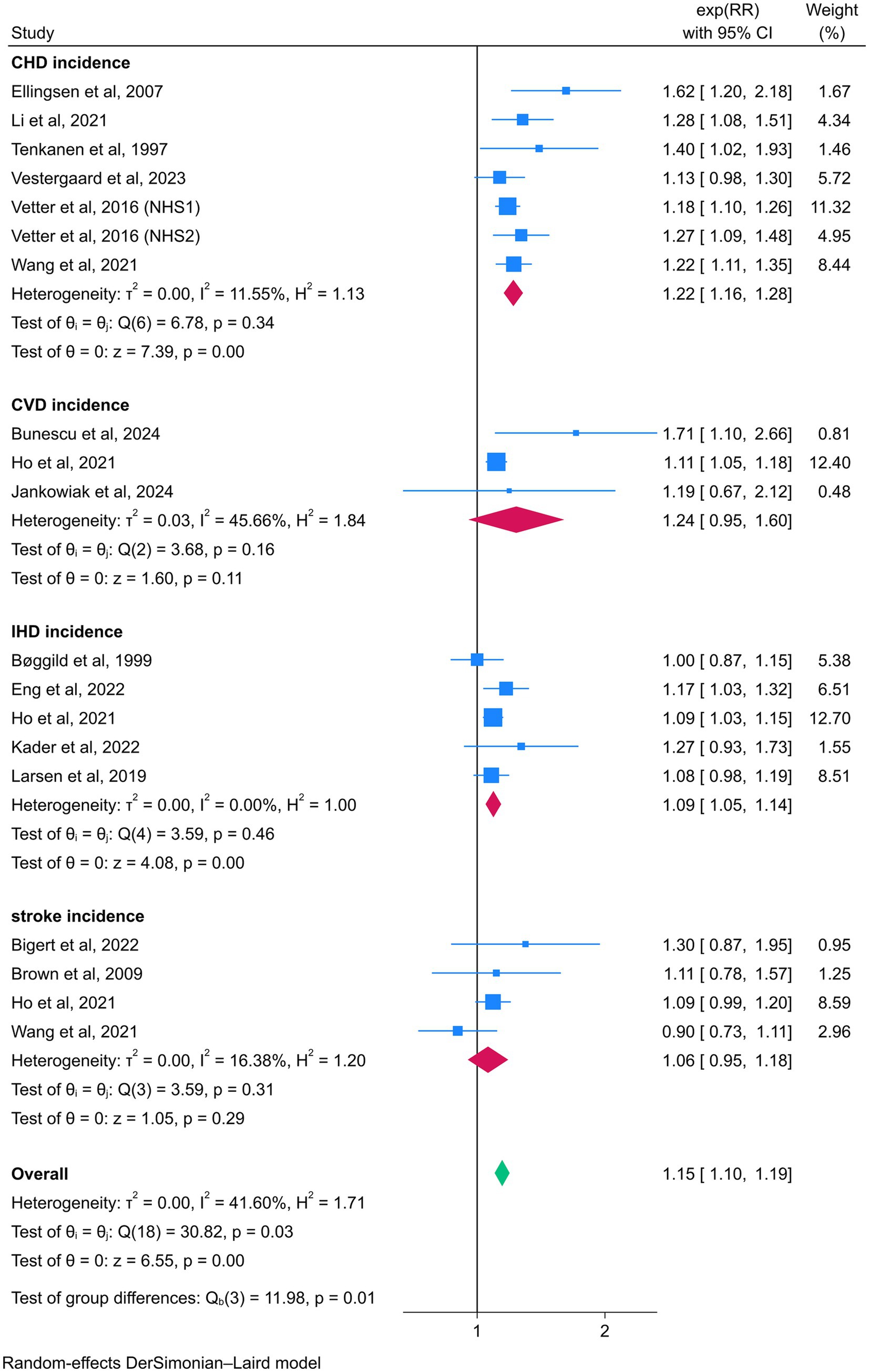 Results: Twenty-three cohort studies were included. Overall, this meta-analysis revealed that night shift work significantly increased the risk of total CVD events (RR = 1.13, 95% CI = 1.10–1.16) and total CVD mortality (RR = 1.27, 95%CI = 1.18–1.36). Dose-response analysis indicated that each 5-year increment in shift work duration was associated with a 7% higher risk of CVD incidence (RR = 1.07, 95% CI: 1.04–1.09) and a 4% increased risk of CVD mortality (RR = 1.05, 95% CI: 1.03–1.06). Subgroup analyses identified elevated risks for incident coronary heart disease (CHD) (RR = 1.22, 95% CI = 1.16–1.28) and ischemic heart disease (IHD) (RR = 1.09, 95% CI = 1.05–1.14), but not stroke (RR = 1.06, 95% CI = 0.95–1.18), and night shift work was associated with an increased risk of mortality due to CHD (RR = 1.22, 95% CI = 1.10–1.36), IHD (RR = 1.39, 95% CI = 1.06–1.84), and stroke (RR = 1.49, 95% CI = 1.04–2.12).