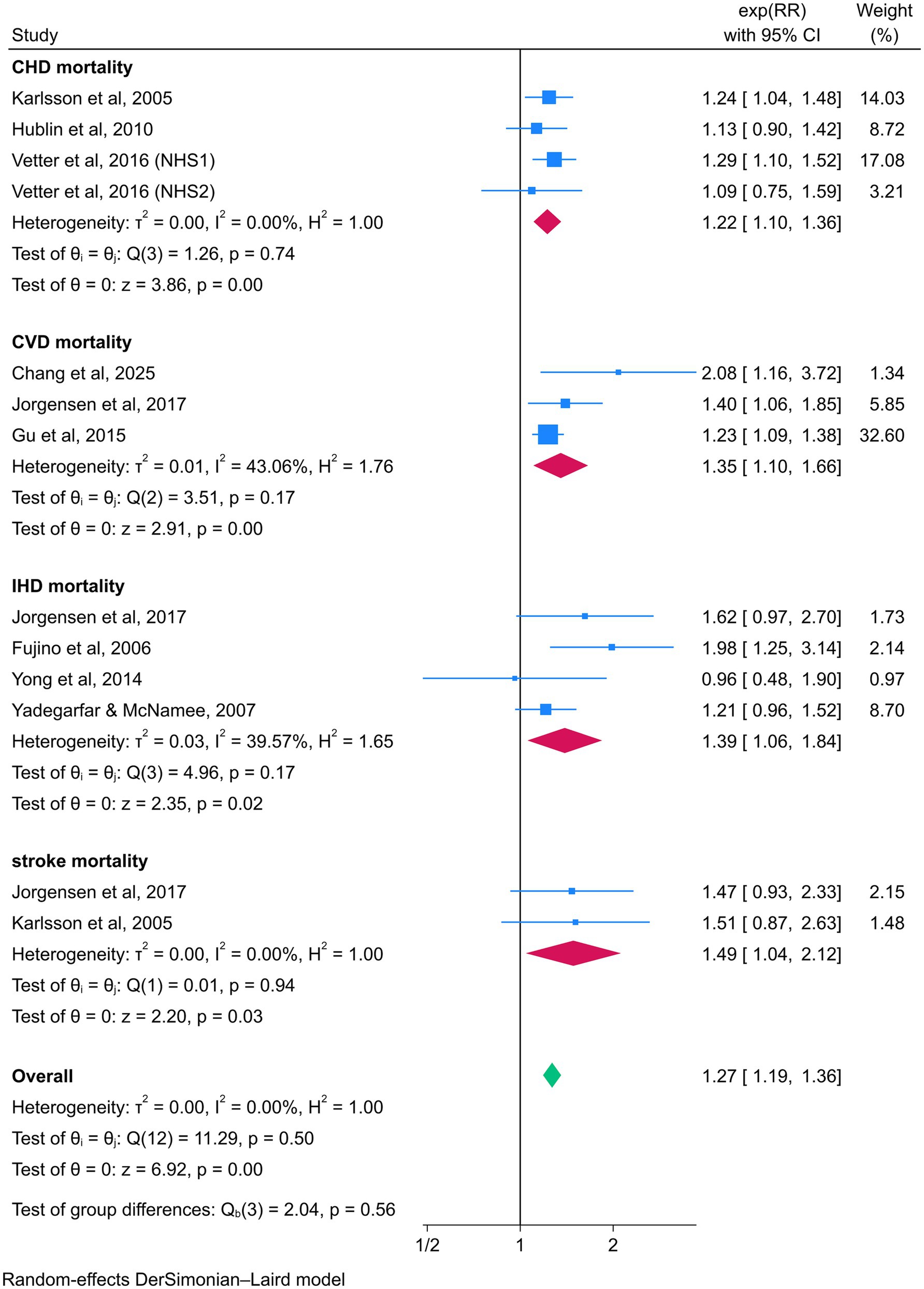 In subgroup analyses examining the association between night shift work and CVD events, night shift workers exhibited significantly higher risks of CHD (RR = 1.22, 95% CI = 1.16–1.28) and IHD (RR = 1.09, 95% CI = 1.05–1.14) compared to daytime workers. However, no statistically significant associations were observed for CVD (RR = 1.24, 95% CI = 0.95–1.60) or stroke (RR = 1.06, 95% CI = 0.95–1.18). In contrast, subgroup analyses focusing on CVD mortality revealed elevated risks among night shift workers for CHD (RR = 1.22, 95% CI = 1.10–1.36), CVD (RR = 1.35, 95% CI = 1.10–1.66), IHD (RR = 1.39, 95% CI = 1.06–1.84), and stroke (RR = 1.49, 95% CI = 1.04–2.12) (Figures 5, 6).