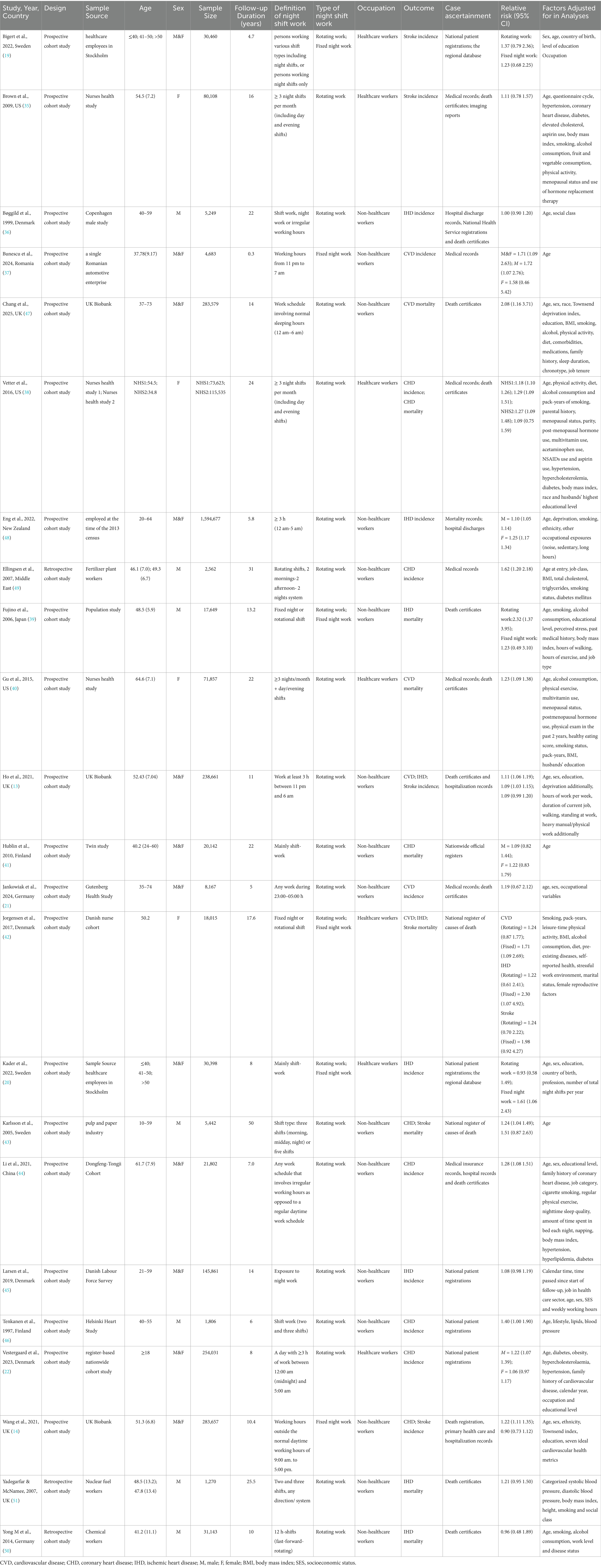 The included studies investigated associations between night shift work and CVD incidence/mortality risks, primarily targeting the following outcomes: CVD, CHD, IHD, and stroke. Case ascertainment was primarily based on local hospital admission records and death certificates. Definitions of night shift work varied across studies: most involved rotating night shifts, whereas others assessed fixed night shifts. Study characteristics are summarized in Table 1.