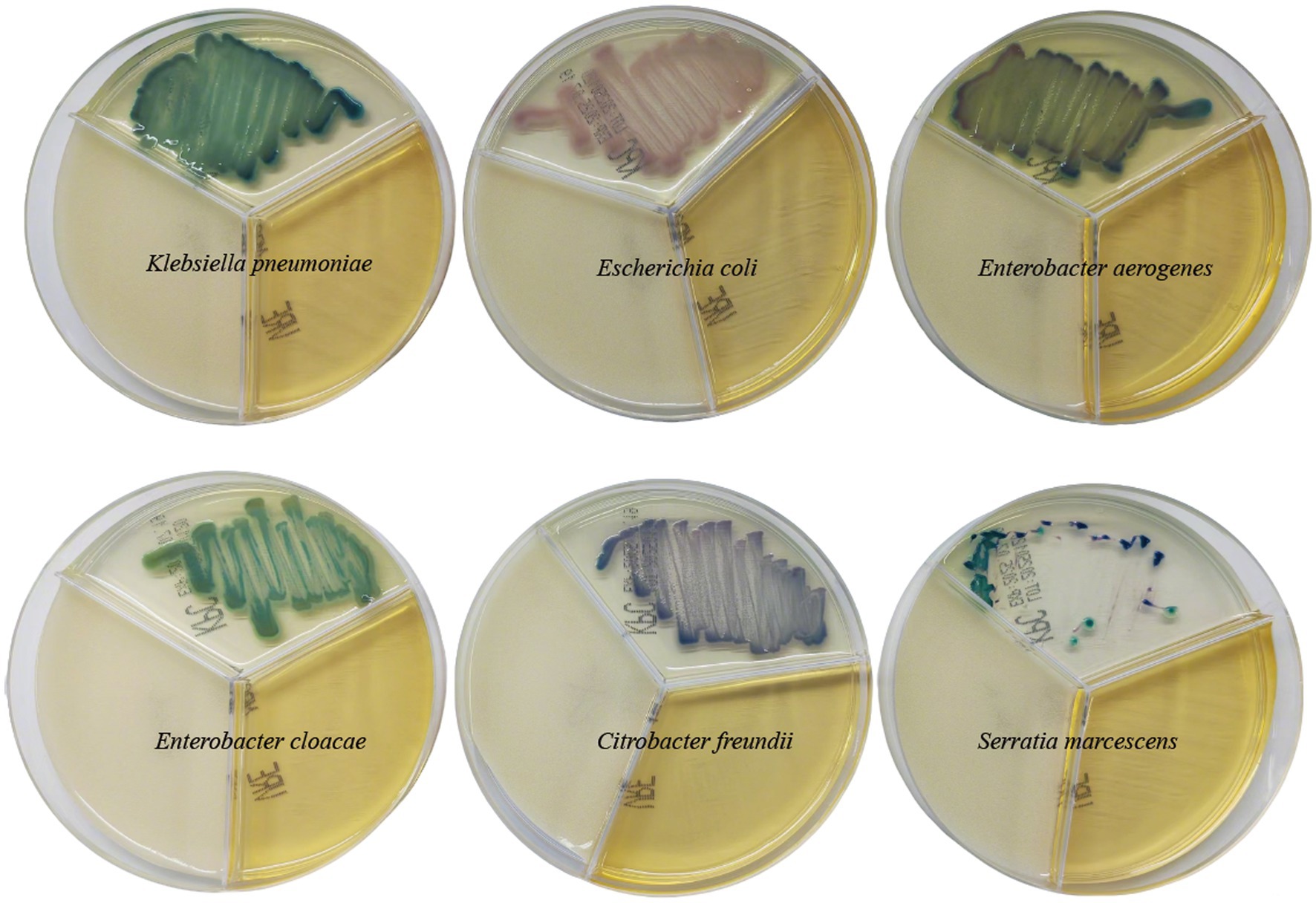 Petri dishes with three compartments, each containing different bacteria cultures on agar. The top row includes Klebsiella pneumoniae, Escherichia coli, and Enterobacter aerogenes. The bottom row includes Enterobacter cloacae, Citrobacter freundii, and Serratia marcescens. Visible variations in colony coloring suggest different bacterial species.