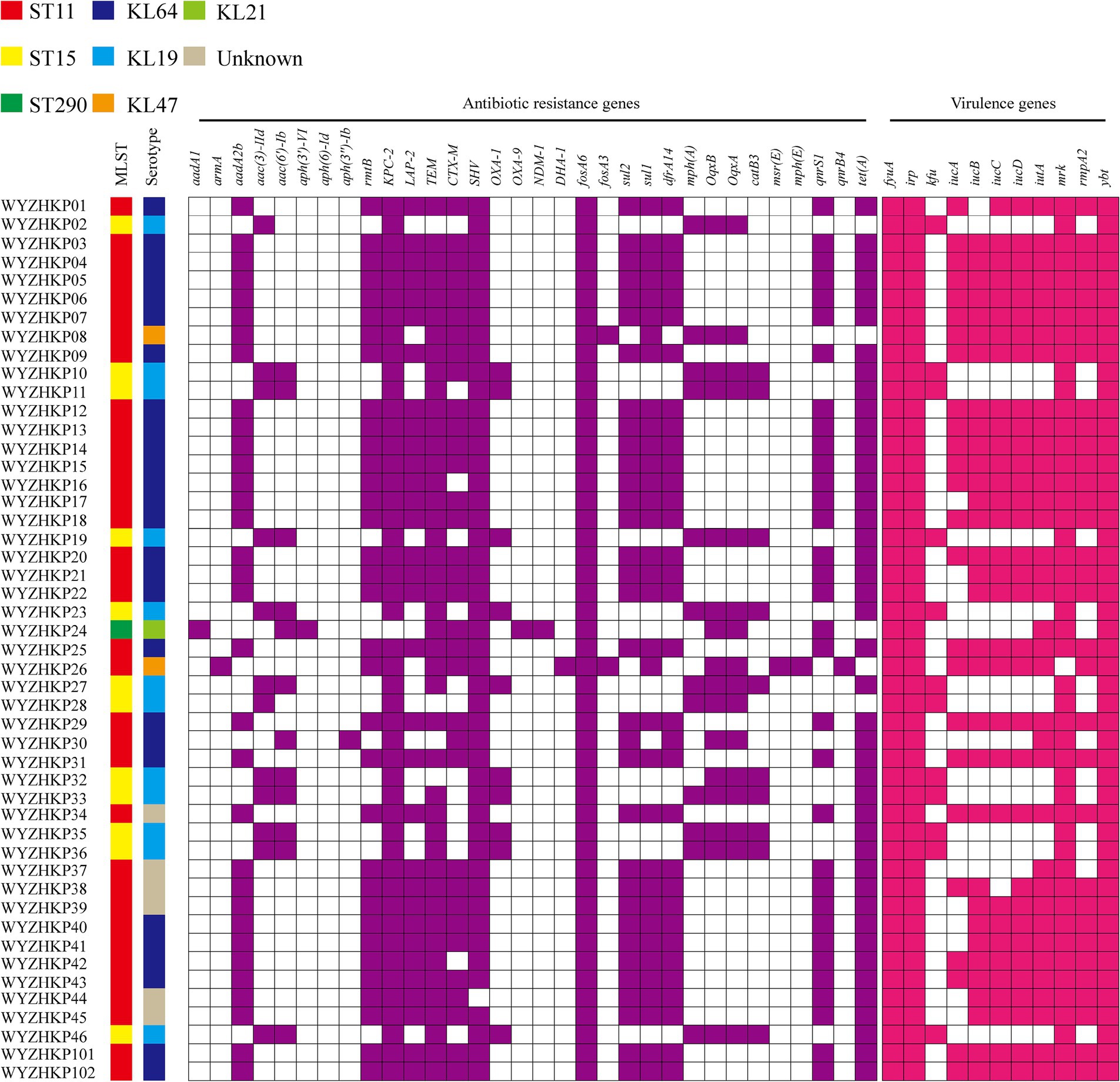 Matrix chart showing the presence of antibiotic resistance and virulence genes across various strains. Columns represent different genes, with antibiotic resistance genes on the left and virulence genes on the right. Rows indicate samples from WZYHK01 to WZYHKP102, categorized by MLST and serotype. Color-coded key for ST and KL groups included. Purple and pink squares mark gene presence.