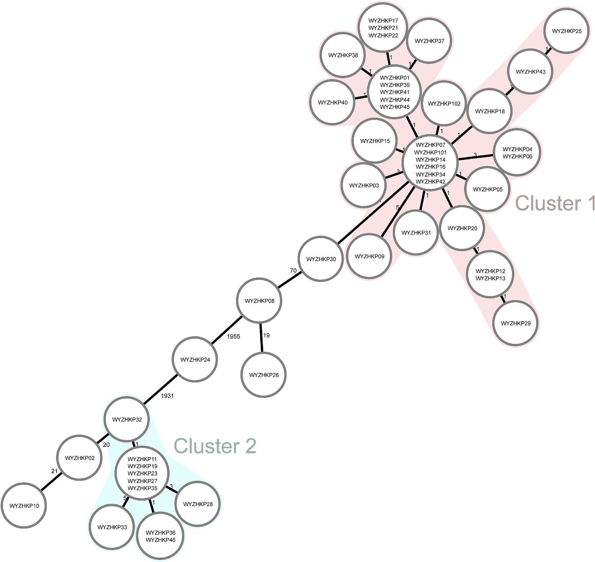 Phylogenetic tree diagram with two main clusters. Cluster 1, shaded in pink, includes various node labels such as WYZHKP01 and WYZHKP17. Cluster 2, shaded in blue, includes nodes like WYZHKP02 and WYZHKP32. Connecting lines have numbers indicating relatedness distances.