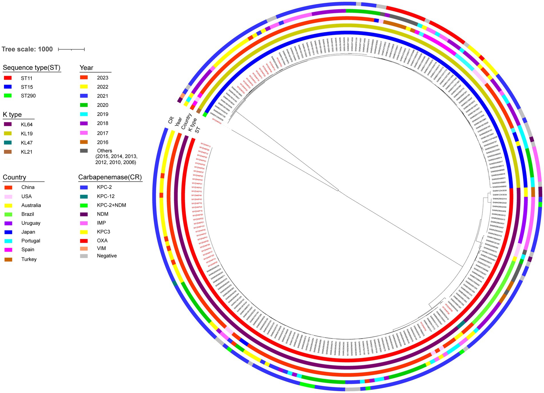 Figure 4. Phylogenetic analysis of 48 local CRKP strains and 185 reference strains. Maximum likelihood phylogenetic tree constructed by core genes of 233 K. pneumoniae isolates. The circles from the inner to the outer represent MLST, K type, country, year, and carbapenemase, respectively. The 48 local K. pneumoniae strains were marked in red.