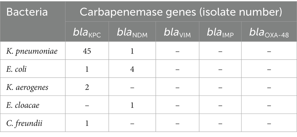 Table 1. Carbapenemase genes in 55 CRE-FC strains.