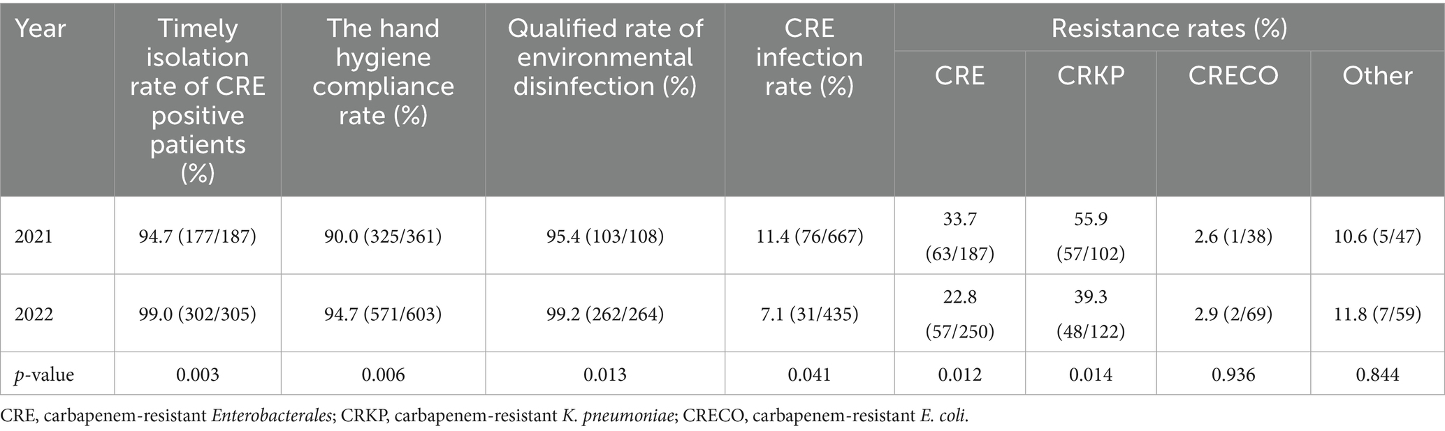 The data presented in Table 2 reveals that in comparison to 2021, the timely isolation rate of CRE-positive patients, the hand hygiene compliance rate, and the qualified rate of environmental disinfection all showed improvements. When it comes to resistance rates, variations were observed among different types of CRE. Specifically, the carbapenem resistance rate of K. pneumoniae in 2022 (39.3%) was significantly lower than that in 2021 (55.9%), with a statistically significant difference. In contrast, the carbapenem resistance rate of E. coli remained relatively stable, being 2.9% in 2022 and 2.6% in 2021, and the difference was not statistically significant. Additionally, the CRE infection rate decreased from 11.4 to 7.1%. Overall, the data indicates that active screening of CRE-FC and the implementation of IPC interventions can effectively reduce the CRE infection rate in ICU wards.