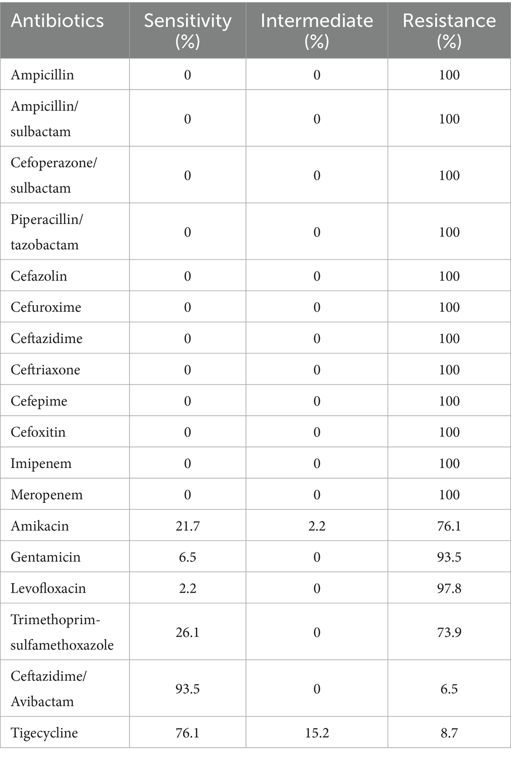 To clarify the antibiotic resistance profile of 46 CRKP strains colonized via feces, we tested their susceptibility to 18 antibiotics (Table 3). All the CRKP strains presented multiple drug resistance phenotypes and were resistant to three or more antibiotic classes. The 46 CRKP-FC strains were resistant to ampicillin, ampicillin/sulbactam, cefoperazone/sulbactam, piperacillin/tazobactam, cefazolin, cefuroxime, ceftazidime, ceftriaxone, cefepime, cefoxitin, imipenem, and meropenem. The antimicrobial resistance rate of ceftazidime/avibactam was the lowest (6.5%), followed by tigecycline (8.7%), trimethoprim-sulfamethoxazole (73.9%), amikacin (76.1%), gentamicin (93.5%) and levofloxacin (97.8%).