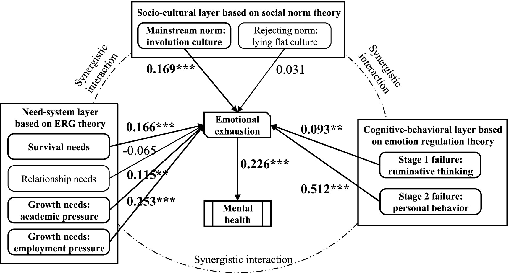 By integrating SEM and QCA, our study concludes that emotional exhaustion among contemporary Chinese college students is not just an individual psychological problem, but has become a systemic issue. This problem is shaped by macro-level cultural and institutional pressures, and multiple stressors permeate into the domain of mental health through social-cognitive processes. The above findings provide a deeper multi-level understanding of college student mental health problems and offer theoretical support for designing subsequent intervention strategies.