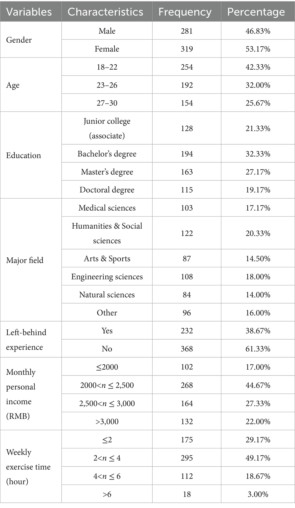 Using a combination of stratified sampling and probability proportional to size (PPS) sampling, we conducted a questionnaire survey across 26 universities in 8 cities of Zhejiang Province. Strata followed the provincial higher education tiers that include Double First Class universities, provincial key universities, and other undergraduate and vocational institutions. Within each stratum we applied PPS at the university level using full time enrollment as the size measure. We computed a sampling interval, drew a random start, and selected universities by cumulative size. Data collection occurred in two stages: a pilot and a main survey. In June 2024, we distributed 97 questionnaires in a pilot test to verify the reliability and validity of the scales. The results showed that the Cronbach’s αfor the questionnaire met acceptable standards, confirming the measures’ internal consistency. The main survey was carried out from July to August 2024, yielding 680 returned questionnaires. Before case cleaning we applied prespecified inclusion–exclusion rules as part of field quality control, removing records with missing values on key fields, entries for height weight or monthly income outside predefined plausibility ranges, and very short completion times relative to the group median; on site staff also checked questionnaire completeness. After excluding invalid responses, we obtained 600 valid questionnaires for an effective response rate of 88.24%.