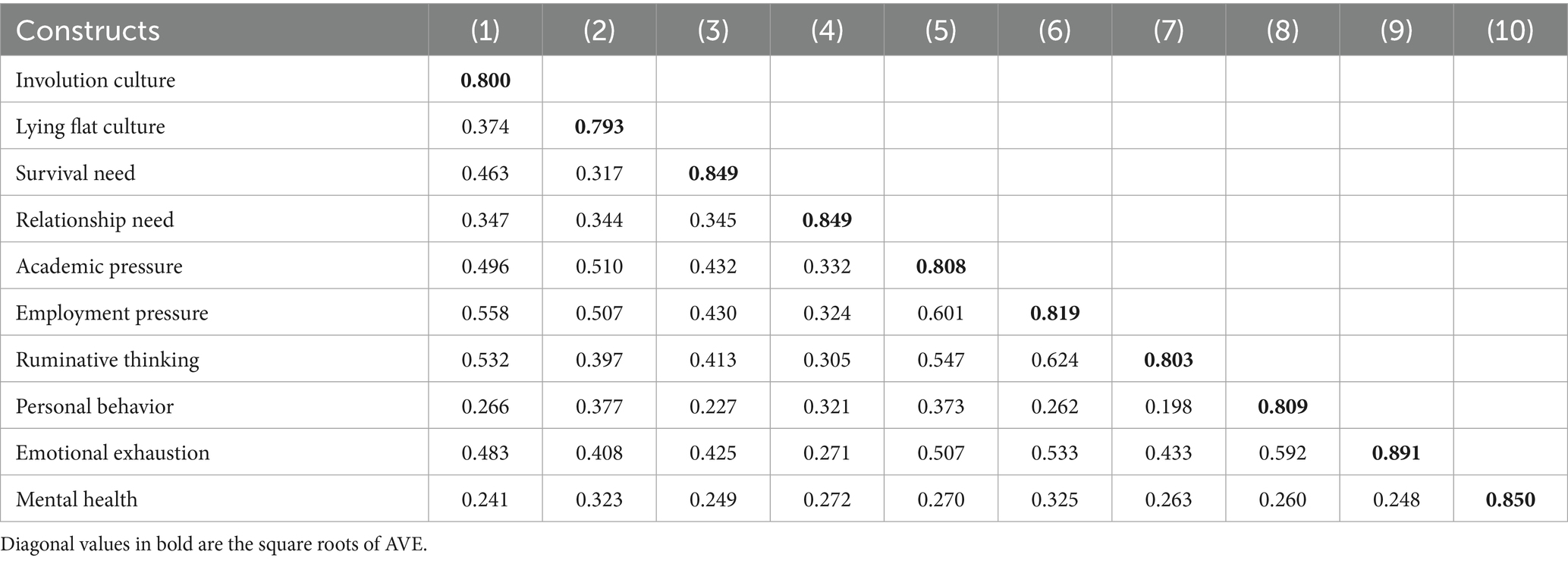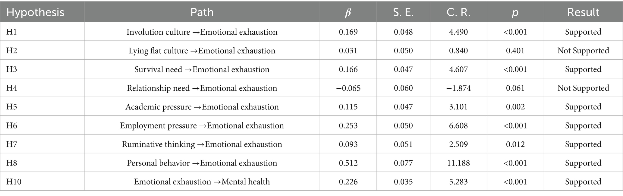 The structural equation model results shown in Figure 2 indicate that personal behavior (β = 0.512***), ruminative thinking (β = 0.093*), academic pressure (β = 0.115**), employment pressure (β = 0.253***), survival need (β = 0.166***), and involution culture (β = 0.169***) have a significant positive impact on emotional exhaustion. In contrast, relationship needs (β = −0.065) and lying flat culture (β = 0.031) do not show a significant effect on emotional exhaustion. Additionally, emotional exhaustion (β = 0.226***) has a significant impact on mental health. To aid interpretation, we read standardized path coefficients with widely used benchmarks for effect magnitude: about 0.10 small, about 0.30 medium, at least 0.50 large, which implies a large effect for personal behavior, medium for employment pressure, and small-to-medium for survival need, academic pressure, ruminative thinking, and involution culture in this sample (Table 3).