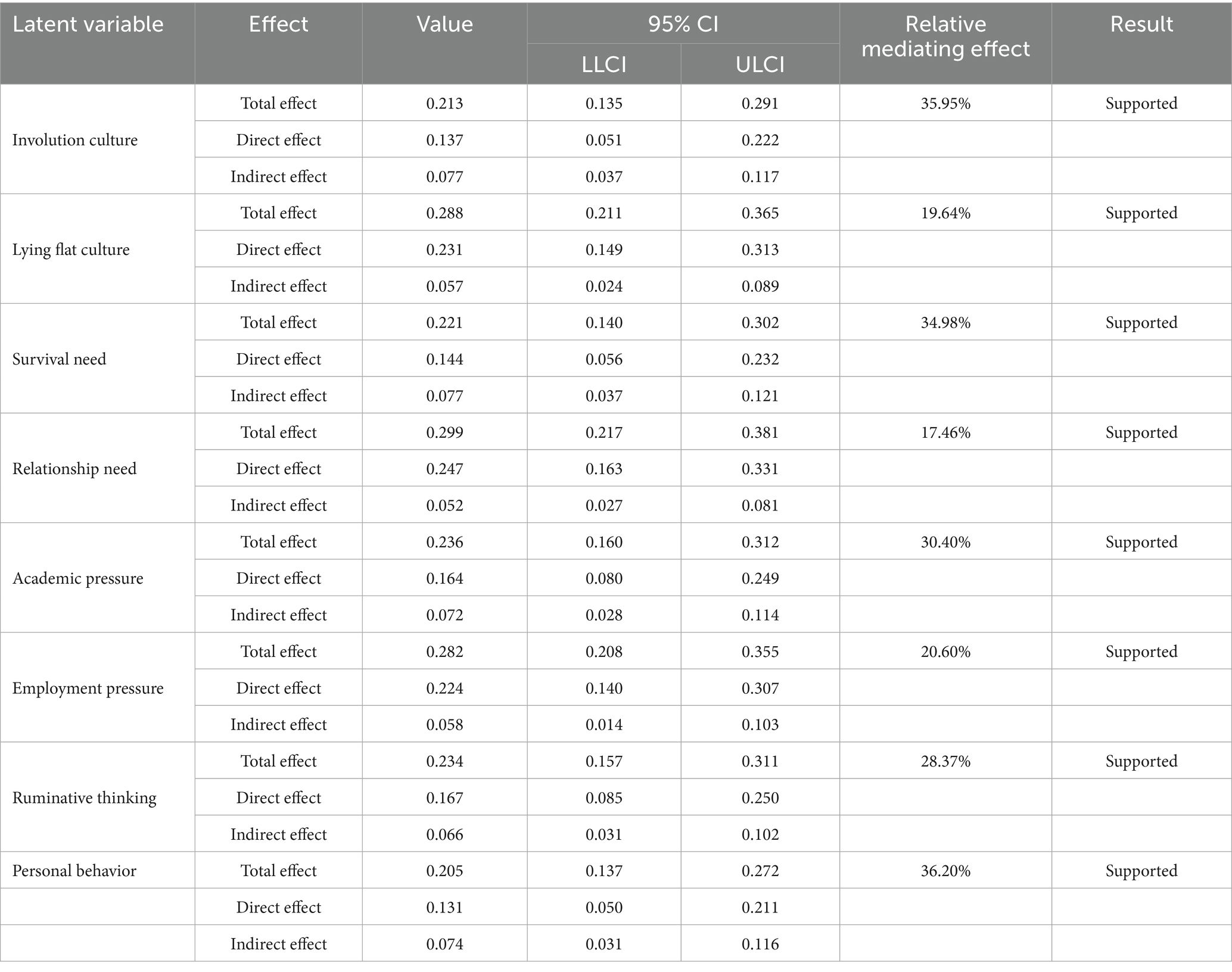 We tested the mediating role of emotional exhaustion (H9) using bootstrapping (5,000 samples) to obtain bias-corrected confidence intervals for indirect effects (52). The bootstrap results (see Table 4) showed that emotional exhaustion significantly mediated the effect of each independent variable on mental health. For all eight predictors—personal behavior, rumination, academic pressure, employment pressure, relationship need, survival need, involution culture, and lying flat culture—the indirect effect via emotional exhaustion was significant (the 95% confidence intervals for indirect effects did not include zero). Thus, H9 is supported, indicating that emotional exhaustion serves as a significant mediator between each of the multi-level stressors and mental health outcomes.
