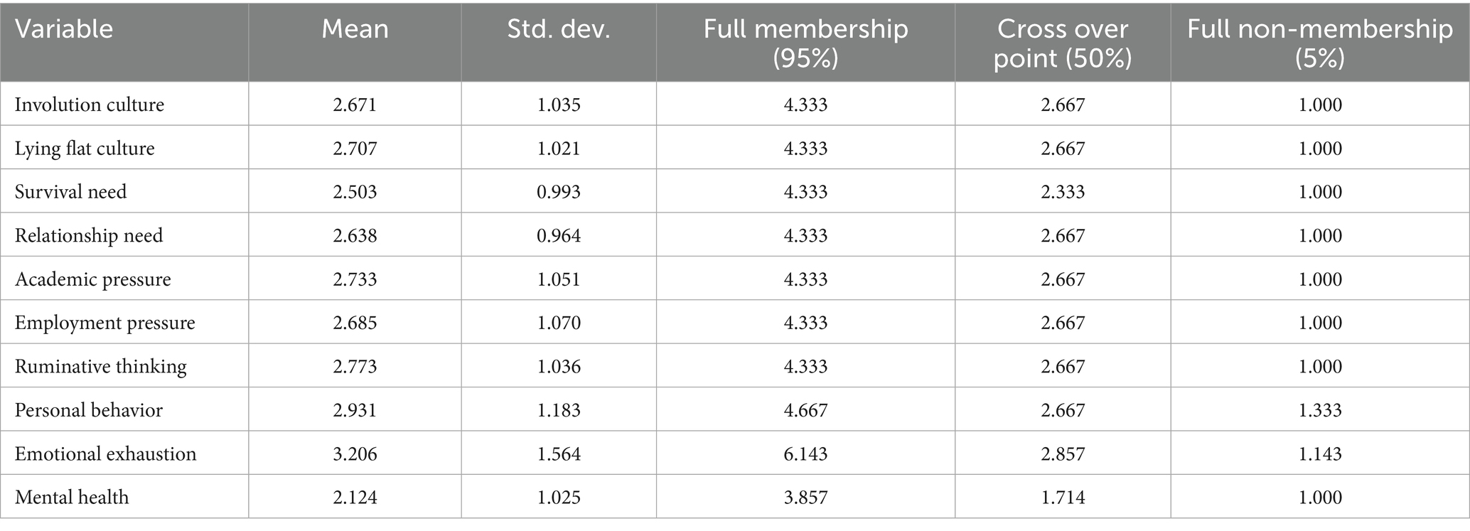 This study used the 5-point Likert scale with options ranging from 1 (strongly disagree) to 5 (strongly agree) to assess respondents’ attitudes to the statements. Emotional exhaustion (the mediating variable) needs a finer degree of distinction so it was measured on a seven-point Likert scale (1 = strongly disagree to 7 = strongly agree) to capture the degree of emotional depletion. Mental health (the outcome variable) was assessed with a frequency scale: respondents indicated how often they experienced certain symptoms in the past 2 weeks (“not at all,” “several days,” “more than half the days,” or “nearly every day”). Mixed response formats were retained to match the validated instruments and preserve construct sensitivity. Items followed validated instruments, and wording was harmonized for readability. Involution culture and lying flat culture were measured using validated scales developed for Chinese college samples Items for relatedness with peers, teachers and family and for survival needs were reverse coded. Higher scores indicate lower unmet need and therefore greater availability of care, support and belonging as well as greater material security. These measures capture perceived availability rather than social skill or objective income, keeping the constructs aligned with our definitions of unmet relatedness and unmet survival need. The demographic characteristics of the sample are summarized in Table 1. The measurement items, their scholarly sources, and the Chinese wording are detailed in Supplementary Tables S1, S2.
