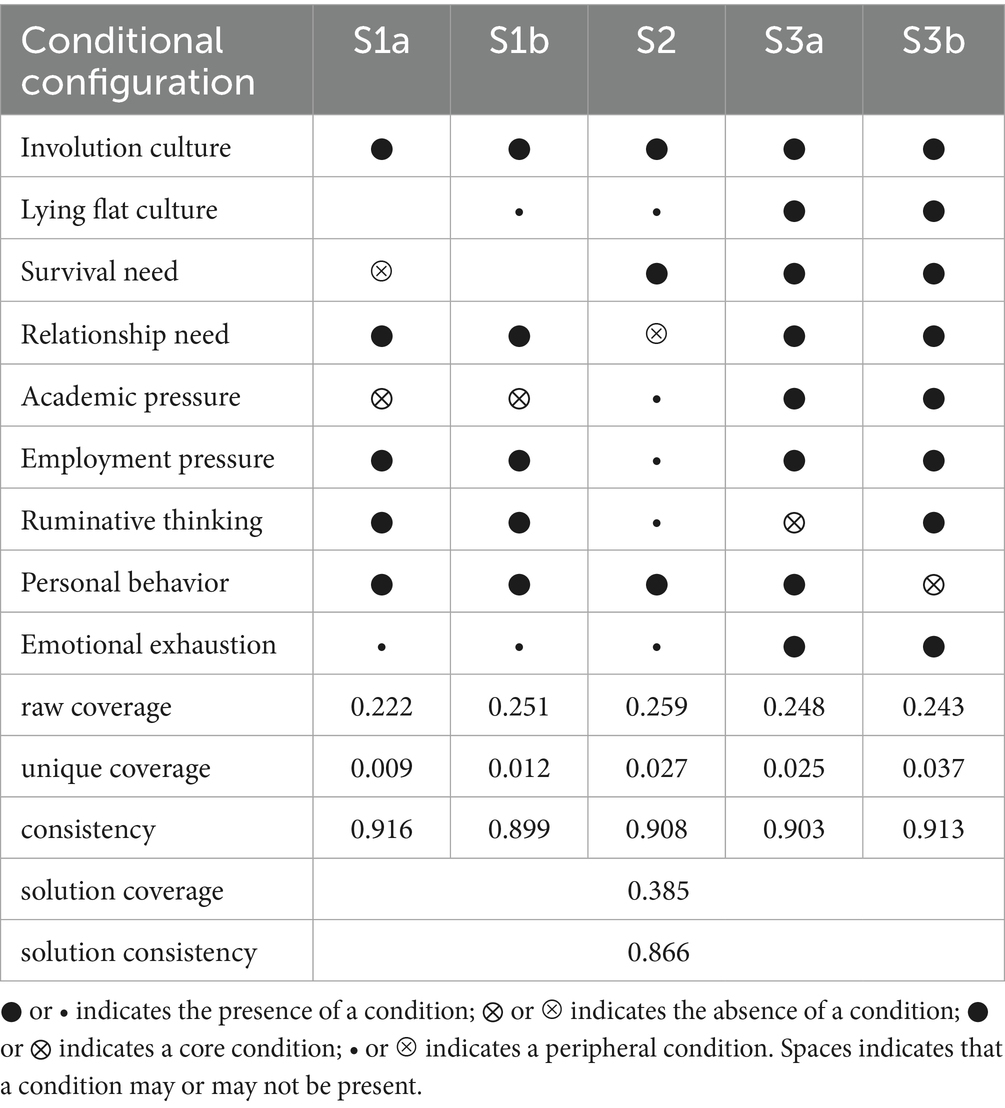 At the macro level, SEM shows that involution culture carries a positive association with emotional exhaustion through a pathway consistent with effort reward imbalance (56). This pathway is not only statistical but also motivational since perceived unfairness invites continued overcommitment that drains regulatory resources, a pattern repeatedly observed in the effort reward tradition. fsQCA sharpens this picture by showing that involution is a core component across configurations, indicating that cultural and institutional pressure becomes decisive when it combines with meso and micro stressors. In configuration A involution travels with high employment pressure and rumination, which turns social comparison into a persistent appraisal of uncontrollable demand. In configuration B involution fuses with survival anxiety and maladaptive behavior, signalling cultural internalization of effort determinism under scarcity. The non-significant average effect of lying flat in SEM is therefore not a paradox but a sign of functional heterogeneity. In Chinese student samples lying flat often operates as a situational tactic rather than a stabilized value in the cultural toolkit sense, which weakens any uniform net association with exhaustion (57). fsQCA clarifies that in configuration C lying flat coexists with high academic and employment pressure where the tactic becomes disengaged avoidance and joins the overload mechanism. Cross cultural evidence explains why the same tactic can appear adaptive or harmful. Western recovery research distinguishes psychological detachment that restores resources during off time from disengagement that undermines recovery when stressors remain high and documents a recovery paradox under heavy stress (58). This suggests a threshold account that fits our mixed evidence. When demands pass a certain level the short term benefits of disengaging are overshadowed by resource loss spirals, so the tactic is non protective on average yet central inside a high strain constellation. SEM captures small average effects while fsQCA reveals conjunctural sufficiency. Structural competition is the macro driver and the meaning of lying flat is contingent on the stress ecology it inhabits (59).
