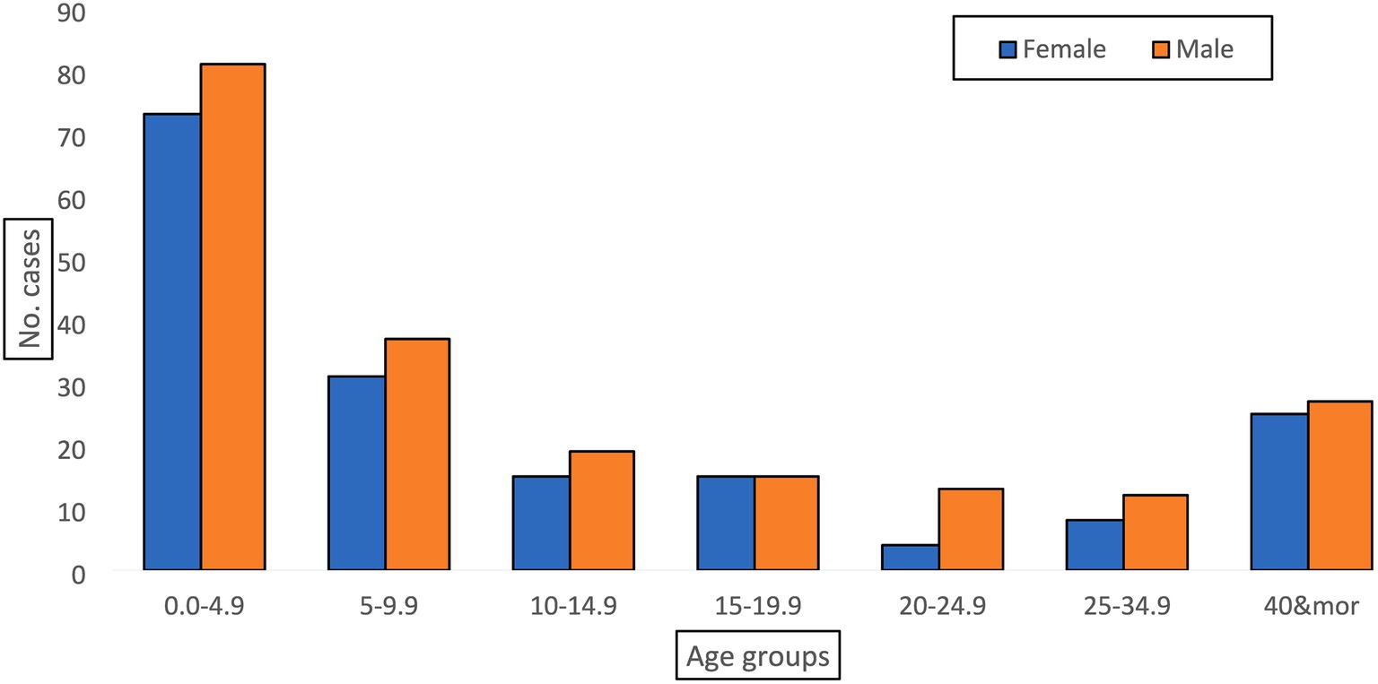 The system revealed its usefulness in detecting the disease and providing valuable epidemiologic indicators to inform decisions. From the line-list, we calculated the overall attack rate (2.36 cases/100,000 population at risk), the positivity rate for the tested specimens (72% positivity rate), time trends of the disease (Figure 1), place distribution, and age distribution (Figure 2). All of these indicators were well represented in the epidemiologic reports from the surveillance directorate and shared with the relevant stakeholders.