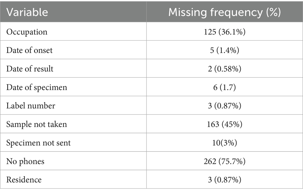 Regarding the completeness of the data entered, 9 variables in the line-list were identified to have missing values (Table 2). About 36.1% of cases had missing occupation data. About 75.7% percent of cases had no contact numbers for follow-up and communication if further data were needed.