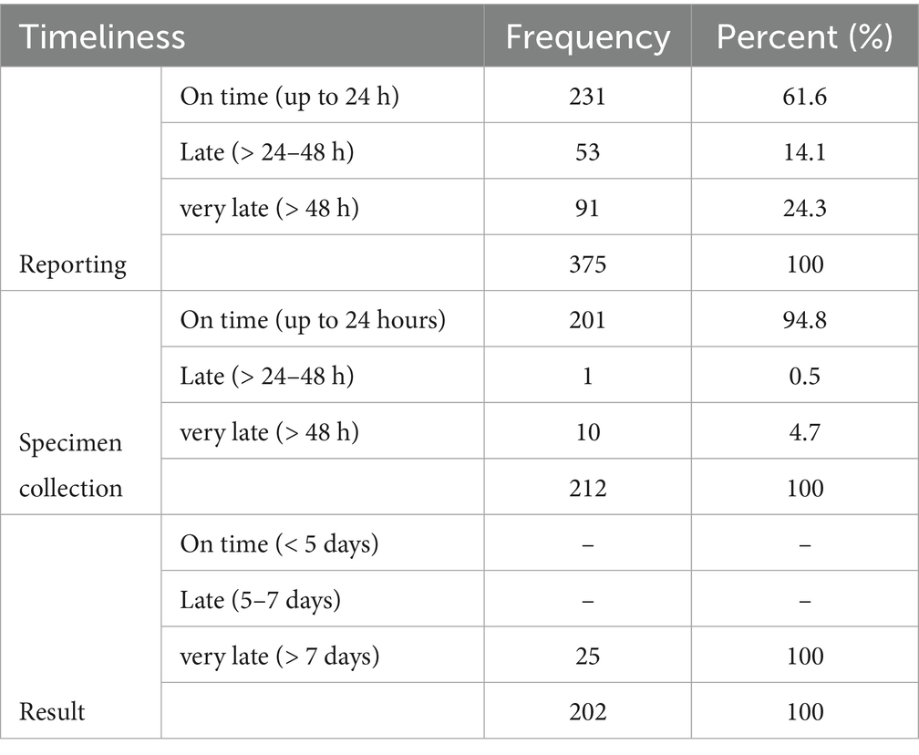 Timeliness was assessed in terms of: firstly, the time between detection and reporting (within 24 h was considered on-time, 24–48 h was considered late, and more than 48 h was considered very late); secondly, the time between reporting and specimen collection (same as reporting); and finally the time from collection to test result (test result within 5 days was considered on-time, 5–7 days was considered late, and more than 7 days was considered very late).