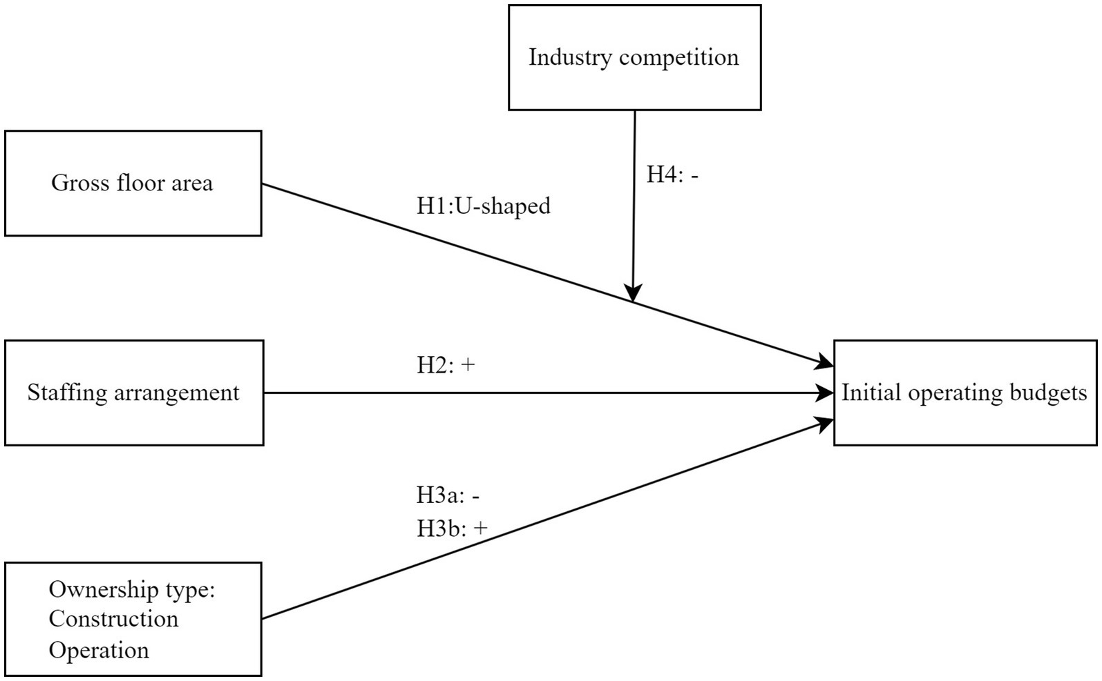 Diagram illustrating factors affecting the initial operating budget. It shows influences from gross floor area (H1: U-shaped), staff arrangement (H2: positive), ownership type (H3a: negative, H3b: positive), and industry competition (H4: negative).