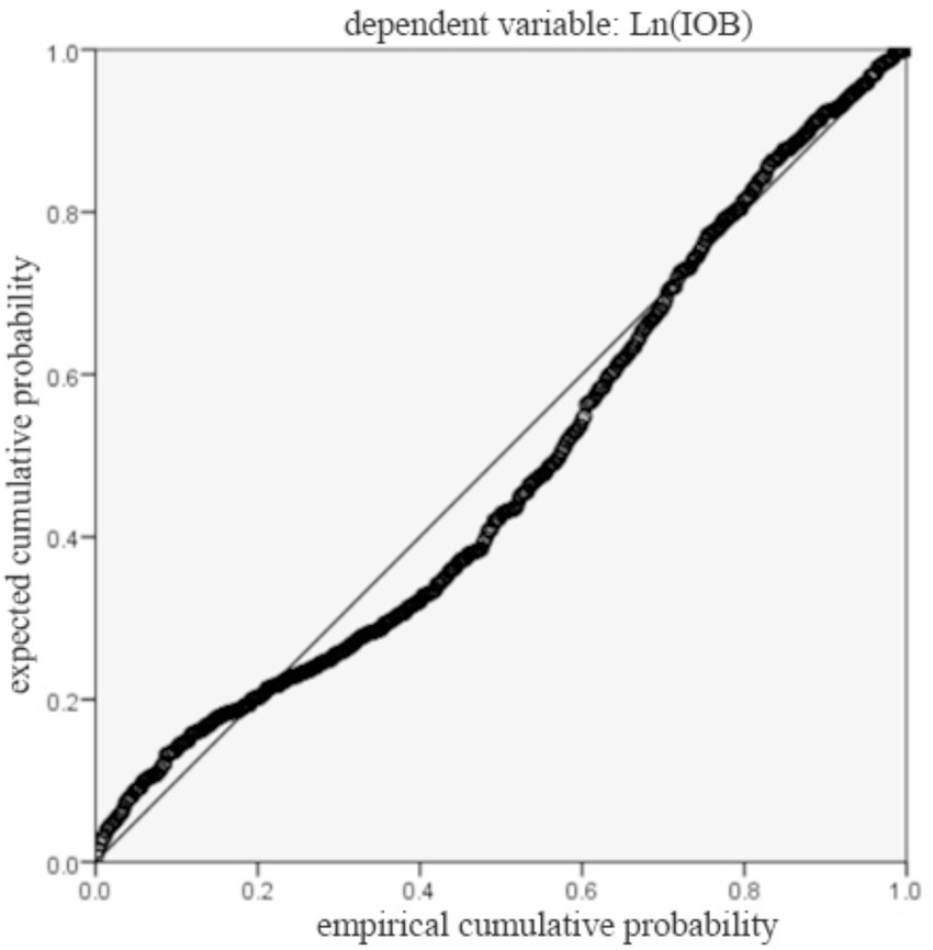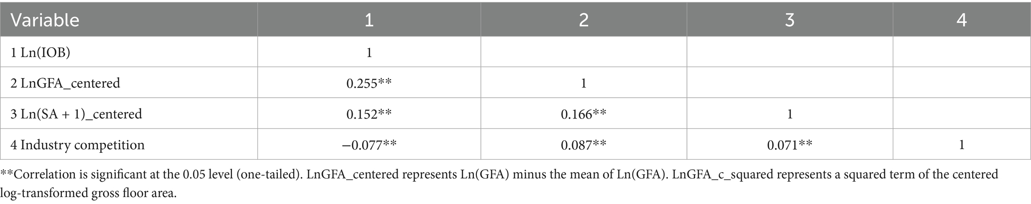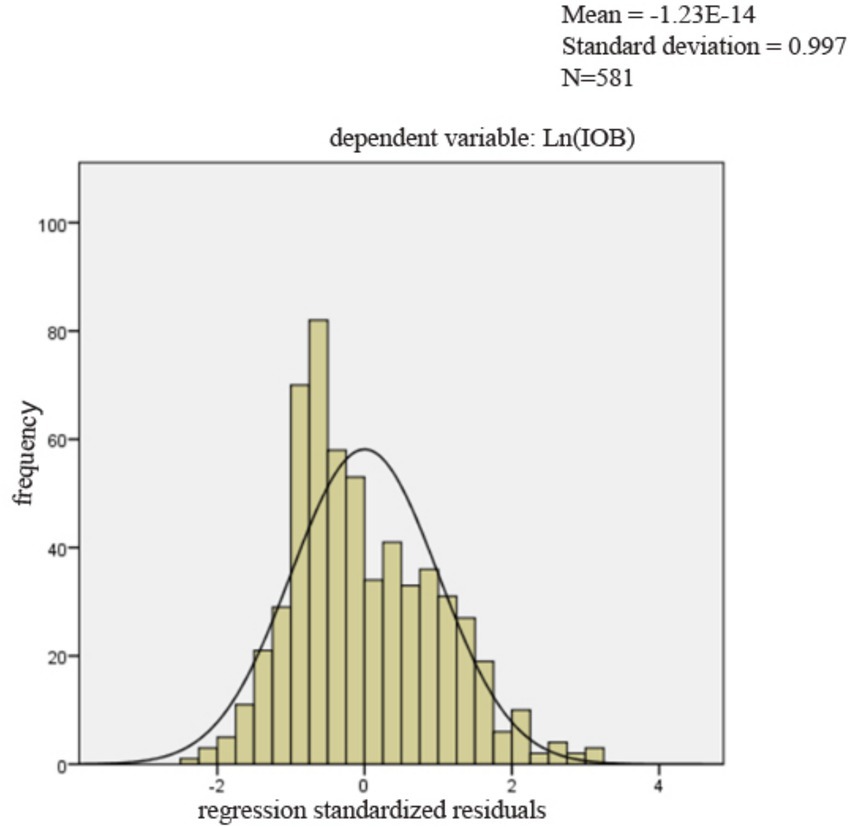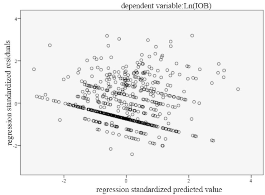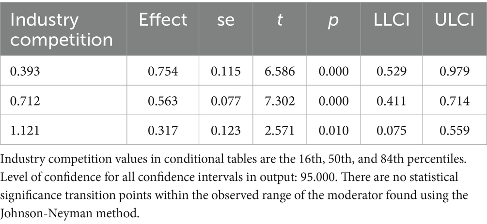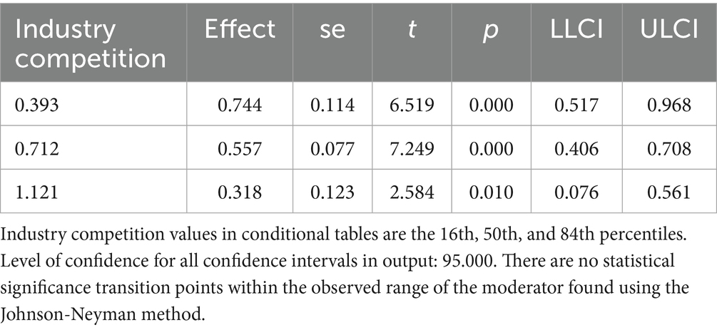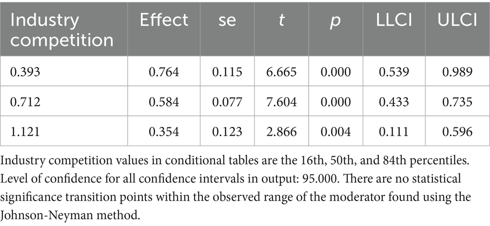 Statistical analyses were conducted with IBM SPSS Statistics 24.0, employing the PROCESS macro (version 3.5) to rigorously examine moderation effects. Descriptive analyses were pursued. Categorical variables were expressed as frequencies and percentages (49). As several variables, including continuous, and nominal variables were used in our study, we conducted Spearman’s rank correlation for continuous variables. Spearman’s rank correlation coefficients between variables were calculated based on the transformed variables to ensure consistency with the subsequent regression models. Point-Biserial correlation for a binary variable and a continuous variable, and Phi correlation analysis between a binary variable and a binary variable were conducted. In the linear regression analysis, tolerance and the variance inflation factor (VIF) measured potential multicollinearity. To evaluate the suitability of the regression model, graphical diagnostics of the residuals were performed. We first examined influence of independent variables on the dependent variable. Then we added control variables together with independent variables to estimate the model using ordinary least squares (OLS) regression. Afterwards, we assessed the moderating effect of industry competition, employing the PROCESS macro developed by Hayes. It can offer added advantages such as Johnson-Neyman analysis, and improved the robustness and interpretability of the results (50). Paying attention to robustness checks could contribute to reducing bias and increasing reliability (51). We conducted robustness checks using additional control variables, bootstrap resampling, and winsorization. Finally, we employ the instrumental variable method to address possible endogeneity issues, considering that endogeneity was a critical concern in research methodologies (52).