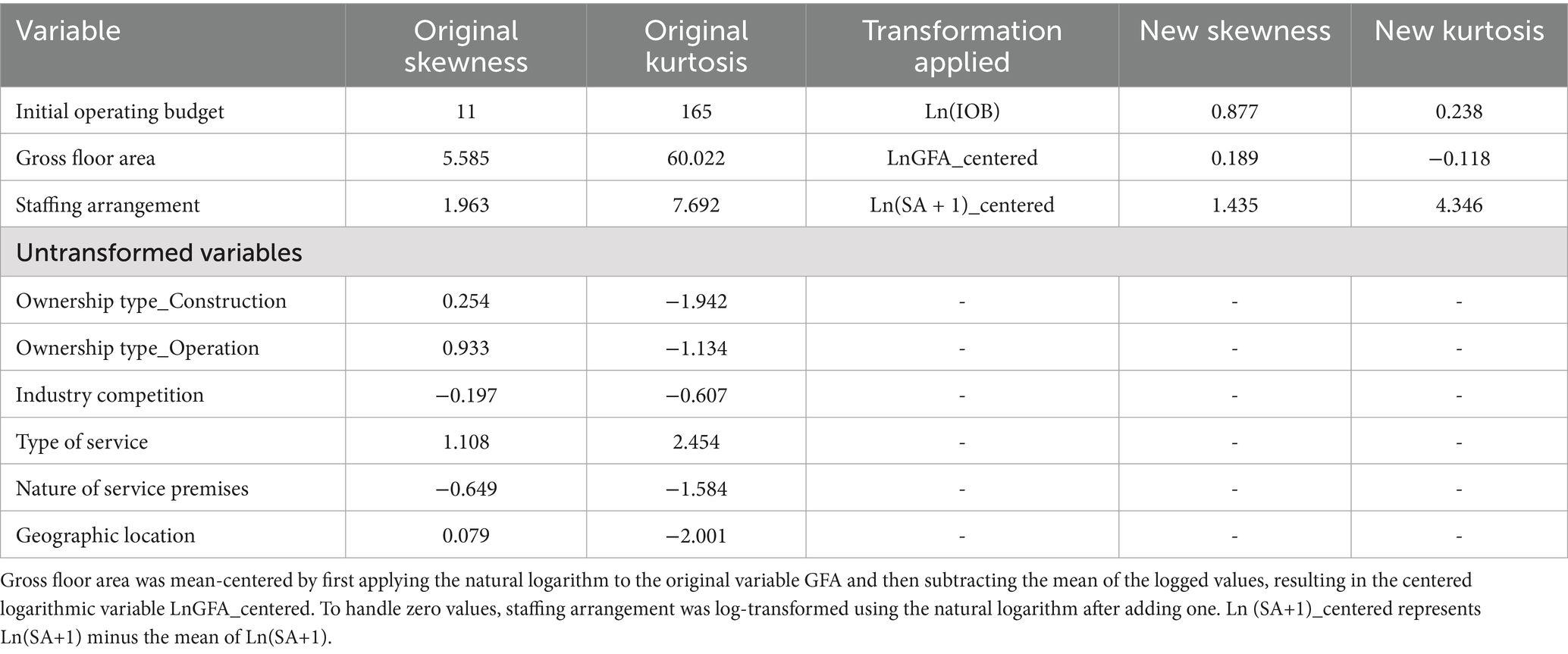 Skewness and kurtosis of variables were examined to assess normality of the key variables. Variables like initial operating budget, gross floor area, and staffing arrangement exhibited significant skewnness and/or kurtosis. Many regression analyses involve transformation of variables (48). Therefore, for variables with significant non-normality, a natural log transformation was applied to improve distributional properties. After processing, the skewness and kurtosis of the variables returned to acceptable ranges (skewness ≤ 2 and kurtosis ≤ 7). It was shown in Table 1.
