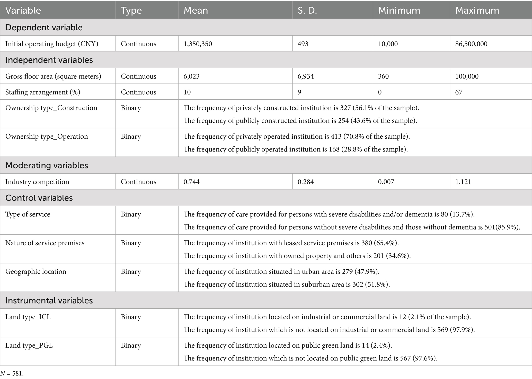 Gross floor area is measured in square meters, usually obtained from government registration records. Staffing arrangement is measured as proportion of professional and technical staff to total employees. Ownership type is a nominal variable, taking reference from some scholars (46). Ownership type is operationalized through two binary dimensions: Construction and Operation. Let Construction be 1 if the long-term care institution is publicly constructed and 0 otherwise. Let Operation be 1 if the long-term care institution is publicly operated and 0 otherwise.