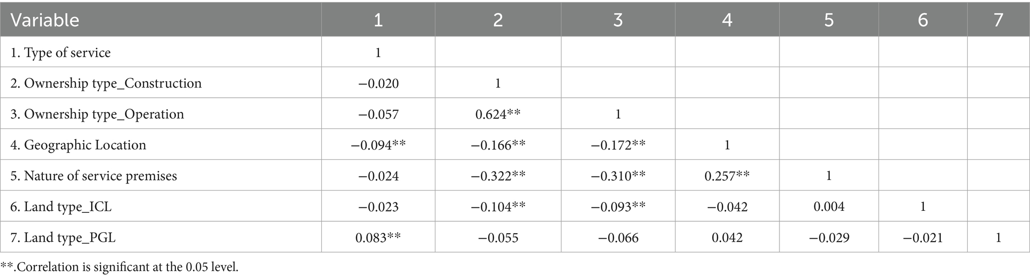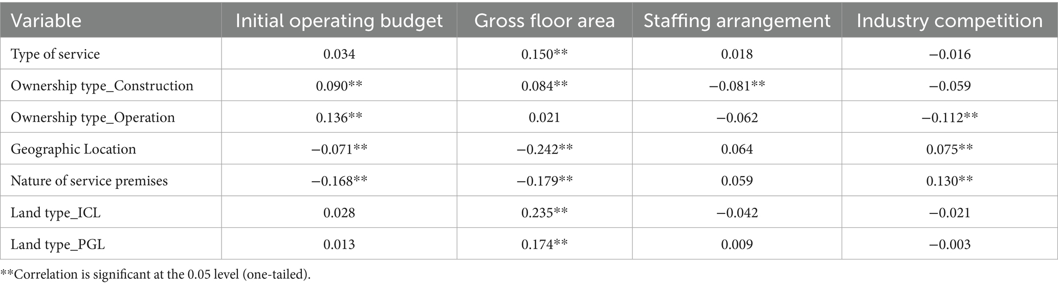 Land type refers to the officially designated land-use category such as industrial, commercial, public green land, or others as recorded in urban planning and land administration documents. We employ two dummy variables: Landtype_ICL and Landtype_PGL. If the long-term care institution is located on industrial or commercial land Landtype_ICL is 1; if not, it is 0. Let Landtype_PGL be 1 if the long-term care institution is in public green land and 0 otherwise.