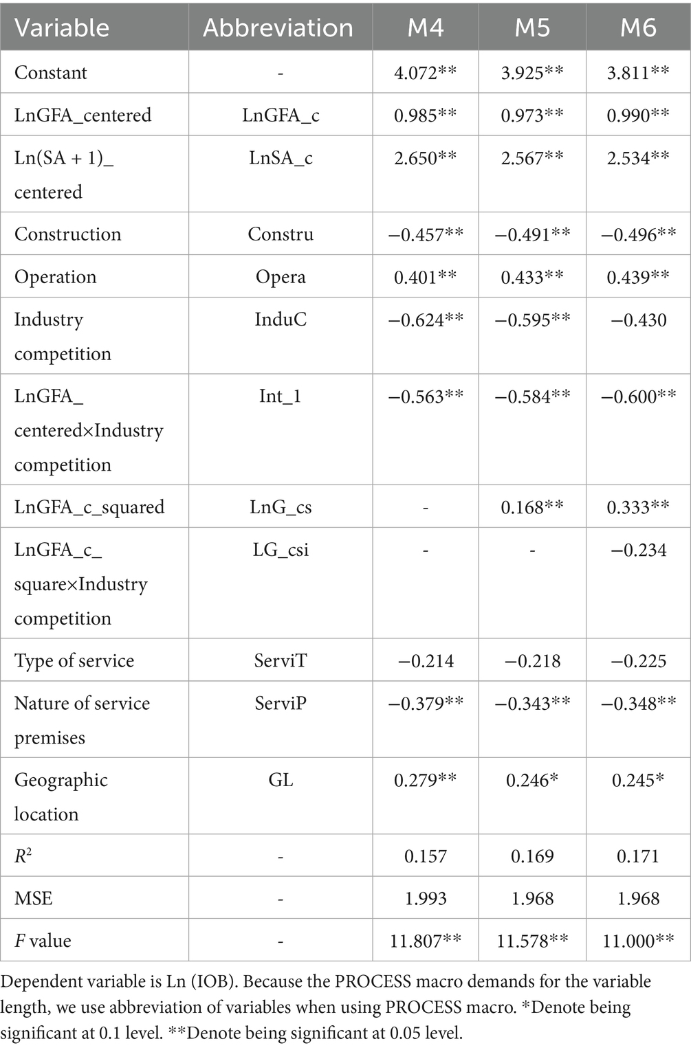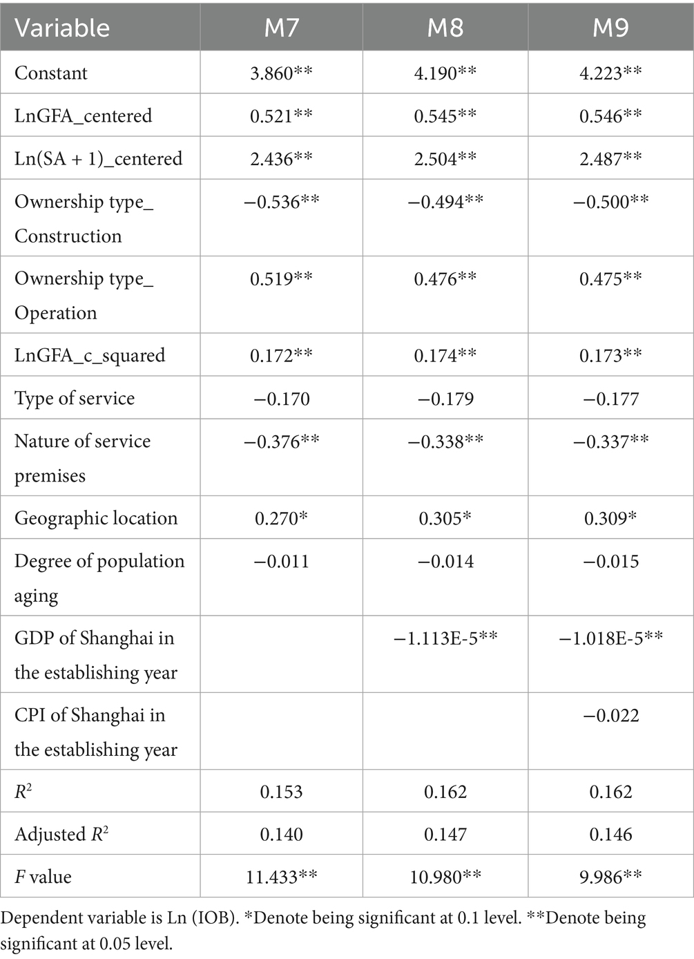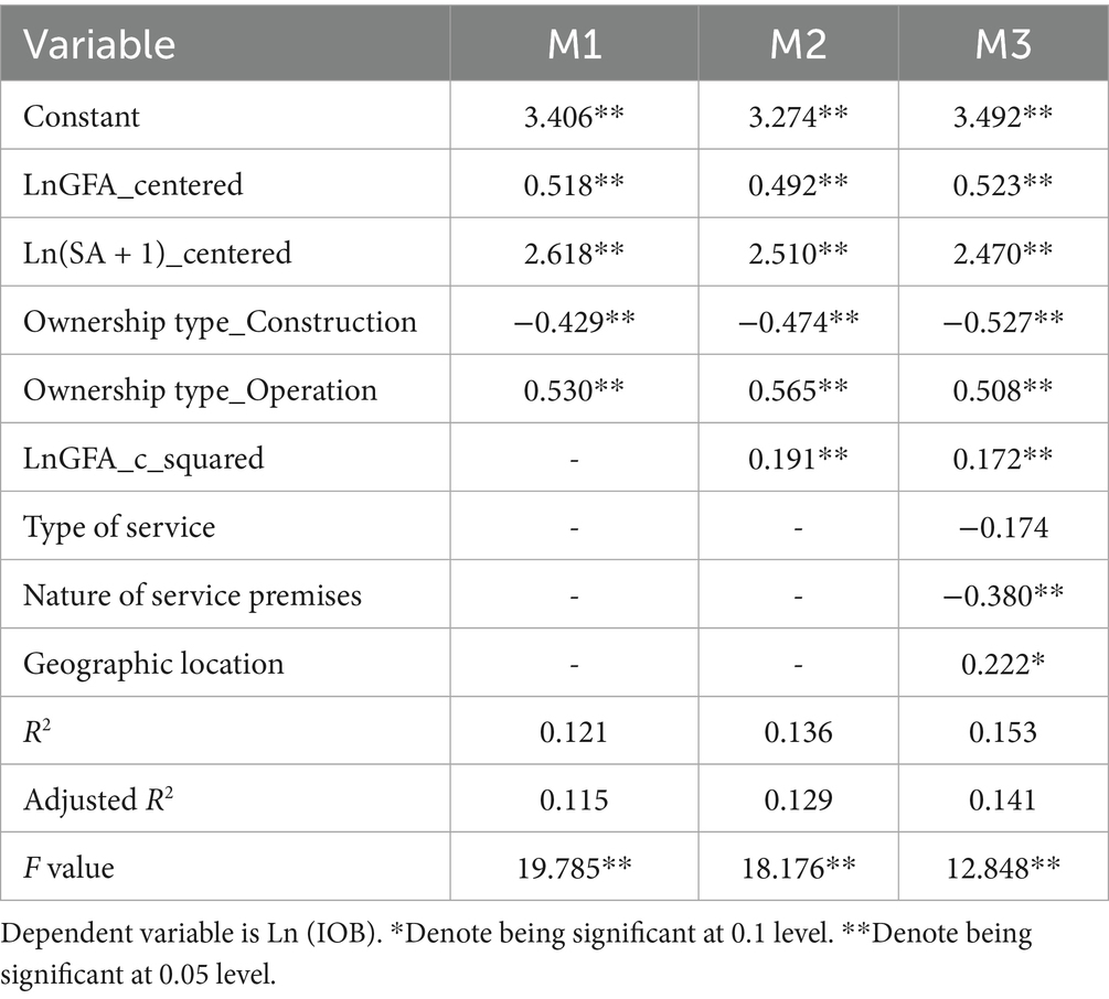 Model 3 incorporates additional control variables, including type of service, nature of service premises, and geographic location. The model explains 15.3% of the variance in Ln(IOB) with an F-test value of 12.848 and p-value < 0.01. The additional controls provide incremental explanatory power. The main effects of LnGFA_centered (β = 0.523, p < 0.01) and staffing arrangements (β = 2.470, p < 0.01) remain positive. The main effects of Ownership type_Construction (β = −0.527, p < 0.01) and Ownership type_Operation (β = 0.508, p < 0.01) remain robust too. Type of service had no significant impact on the initial operating budget (ß = −0.174, p > 0.05). Nature of service premises is negatively and significantly associated with Ln(IOB) (β = −0.380, p < 0.05), while geographic location is positively significant (β = 0.222, p < 0.1). The coefficient for LnGFA_c_squared was positive and significant (β = 0.172, p < 0.01). Therefore, H1, H2, H3, H3a and H3b were further supported.