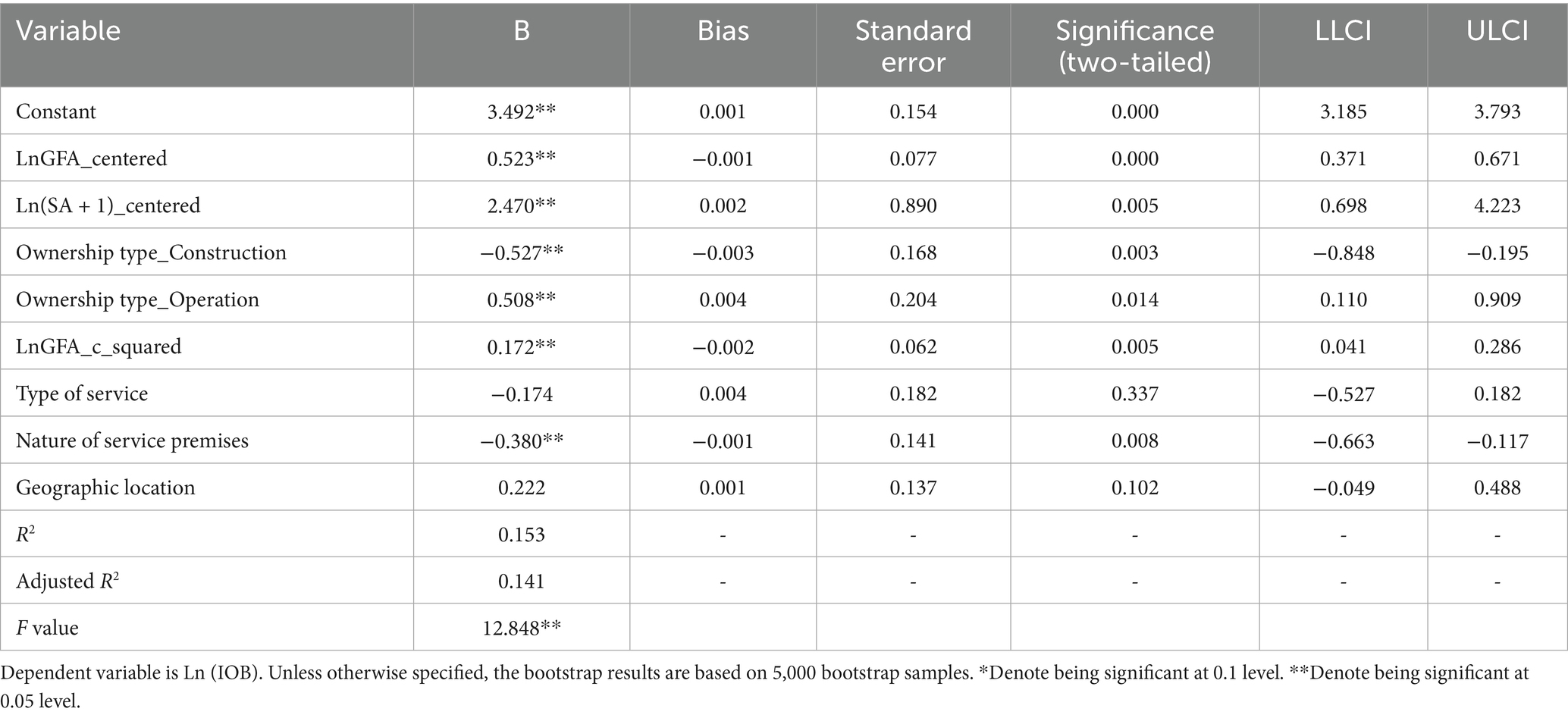 Results of Model 2 showed that the regression model was significant, with an F-test value of 18.176 and p-value < 0.01. An R-squared value of 0.136 was obtained. The regression coefficient for LnGFA_centered (ß = 0.492, p < 0.05) was positive and significant. Similarly, staffing arrangements had a strong positive effect (β = 2.510, p < 0.01). Ownership type_Construction was negatively related to Ln(IOB) (β = −0.474, p < 0.01), whereas Ownership type_Operation showed a positive effect (β = 0.565, p < 0.01). The coefficient for LnGFA_c_squared was positive and significant (β = 0.191, p < 0.01). Therefore, H1 was supported, holding other factors constant, gross floor area had a U-shaped relationship with the initial operating budget. H2, H3, H3a and H3b were all supported.