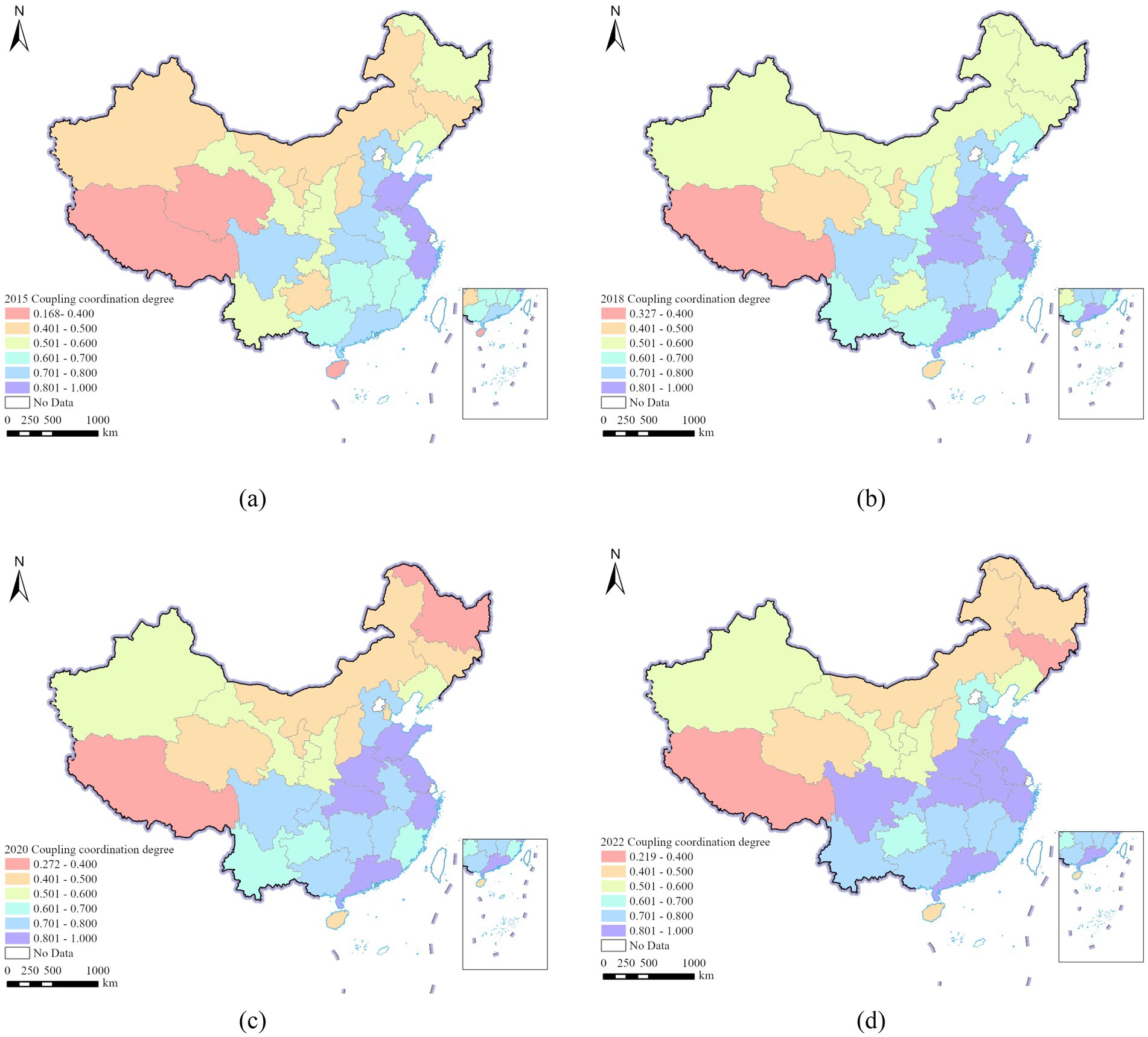 Figure 2. Spatial distribution of CCD in 29 Chinese provinces, (a) 2015, (b) 2018, (c) 2020, (d) 2022.