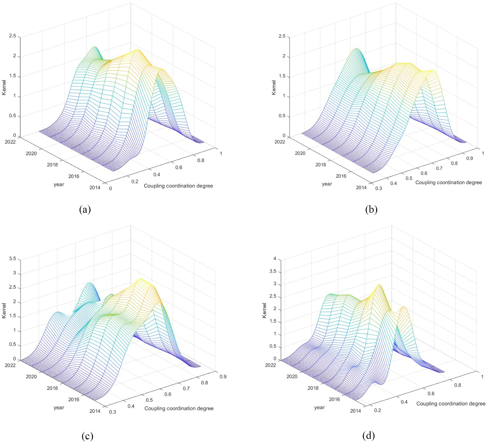 This study uses kernel density curves to describe the temporal evolution of the CCD, and estimates the probability density. Assuming it describes random variable x’s density., the formula is as shown in Equation 11: