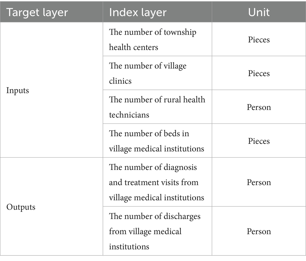 Based on existing research on medical service efficiency (54, 55), this paper divides the efficiency of rural healthcare services into two parts: input indicators and output indicators. Input indicators include the number of township health centers, the number of village health clinics, the number of rural health technicians, and the number of beds. Output indicators include the number of rural primary care visits and the number of hospital discharges. Specific indicators are shown in Table 2.