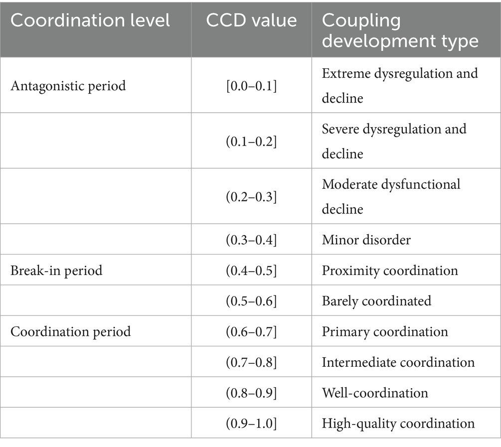 Where represents the coupling degree. represents the CCD. The higher values indicate stronger links correlation of the two systems. and are the comprehensive evaluation indicators for rural village construction and the efficiency of rural healthcare services, respectively. is the comprehensive evaluation index for the overall coordination of the two systems. and denote the respective contribution coefficients of the two systems. Given that digital villages and rural healthcare services form a symmetrical relationship within the model, both are indispensable. Arbitrarily setting different α and β values would introduce subjective bias. Therefore, referencing relevant literature (29), it is assumed that the contributions of the two systems to the coordinated development of coupling are equal, . Furthermore, we categorise CCD values into three interpretable tiers: 0–0.4 (Antagonistic period), 0.4–0.6 (Break-in period), and 0.6–1.0 (Coordination period). The grading of the CCD level of the two systems is shown in Table 3.
