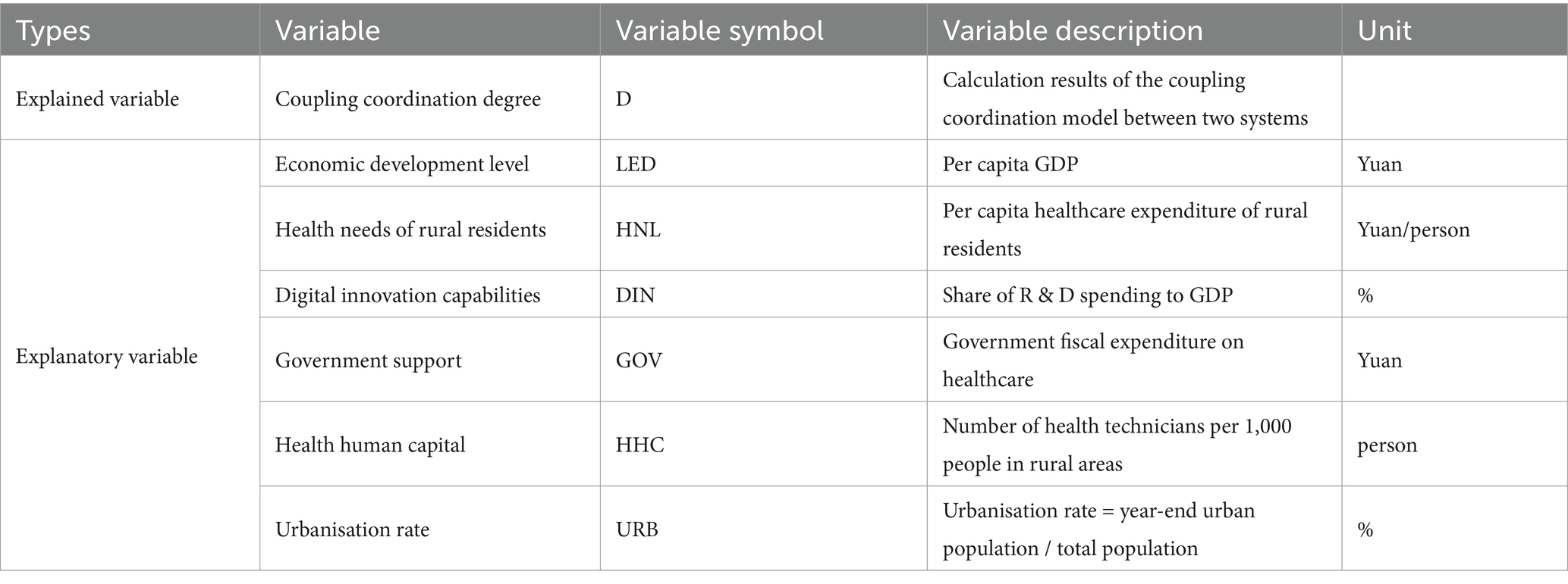In order to further analyse the factors that may affect the construction of digital villages and the efficiency of rural health services, this study refers to existing research (29, 30, 59–61) and combines data availability to analyse the factors that may affect the CCD of the two systems, mainly from the perspectives of economic development level, government institutional support, and population health needs. Finally, factors such as economic development level (LED), government support (GOV), rural residents’ health needs (HDI), digital innovation capacity (DIN), health human capital (HHC), and urbanisation rate (URB) were selected as explanatory variables. Using CCD data from 29 provinces across China from 2015 to 2022 as the explanatory variable. The specific definitions of the explanatory variables are shown in Table 4.